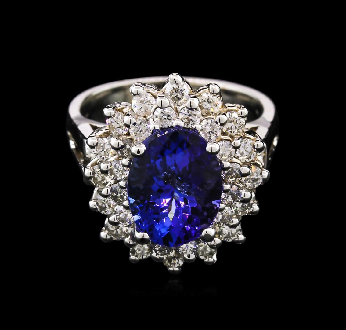 One electronically tested 14KT white gold lady's cast fashion ring with a basket double halo with a bright polish finish. The featured lady's ring has a shank measuring 3.70 millimeters in width. Identified with markings of "14K". Condition is new, good workmanship. Containing: One prong set oval modified brilliant cut natural tanzanite, measuring 10.56 x 7.85 x 6.24mm, approximate weight of 3.50ct., clarity is moderately included, type I, medium dark, moderately strong, violetish blue color, (GIA vB 6/4), cut is very good. Transmitting light with no distortion, transparent. Colored gemstones are presumed to have been subjected to commonly used enhancement processes. Graded in the setting. Thirty-Two prong set round brilliant cut diamonds, measuring 2.00 - 1.90 x 1.21mm (depth est.) approximate total weight of 32 Stones = 0.90ct. Graded in the setting. Clarity: SI-1 to I-1. Color: H - Good. Total Weight of Colored Stones 3.50ct. Total Weight of Diamonds 0.90ct. Total Weight of Ring 8.40gm. GAS Appraised at $8,280.00.