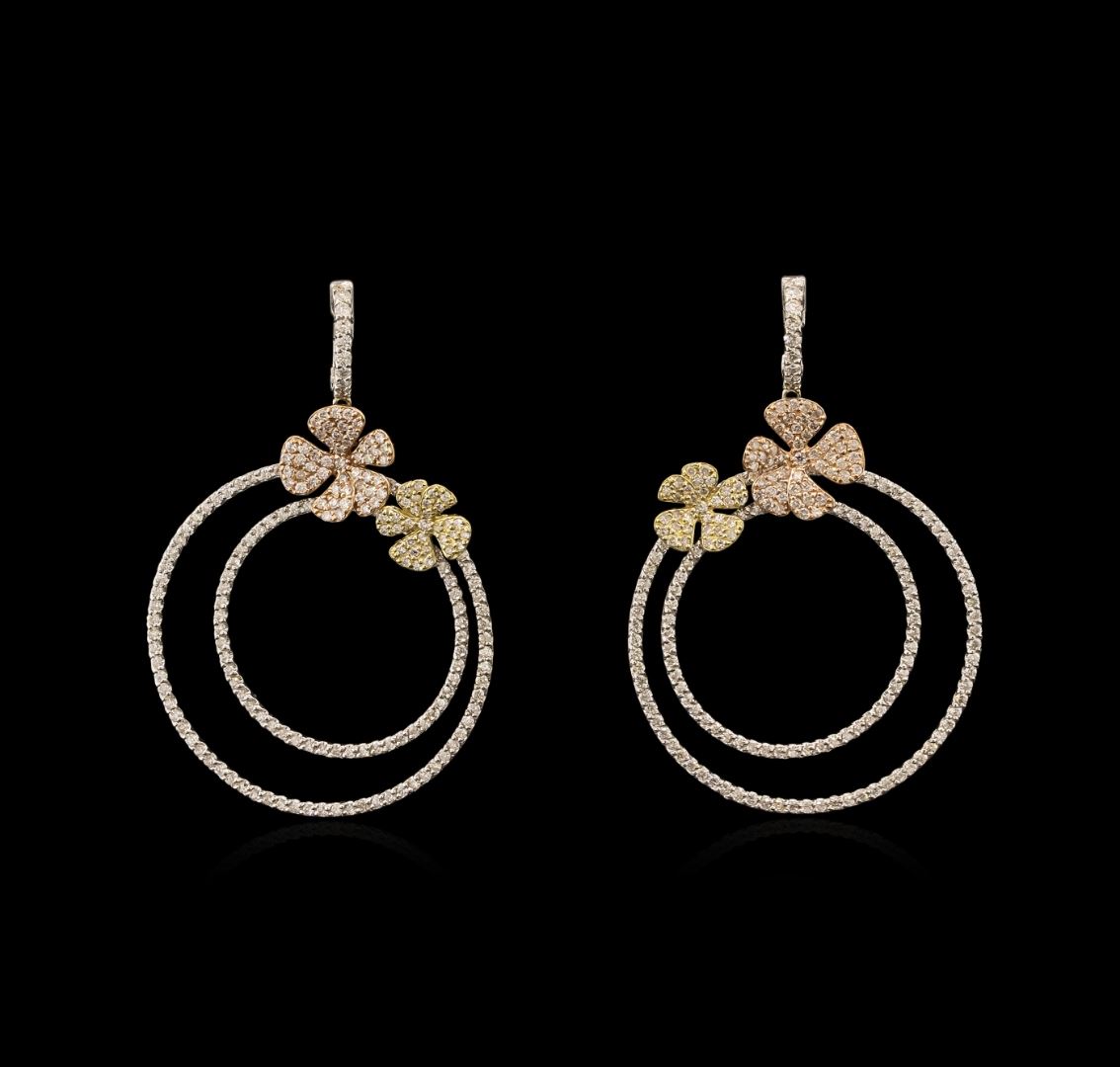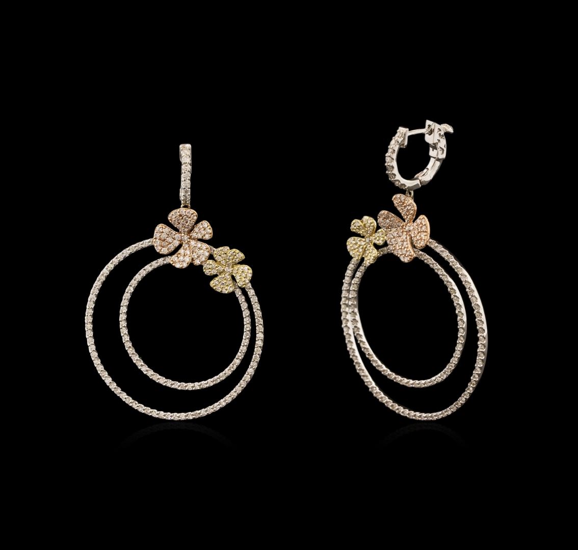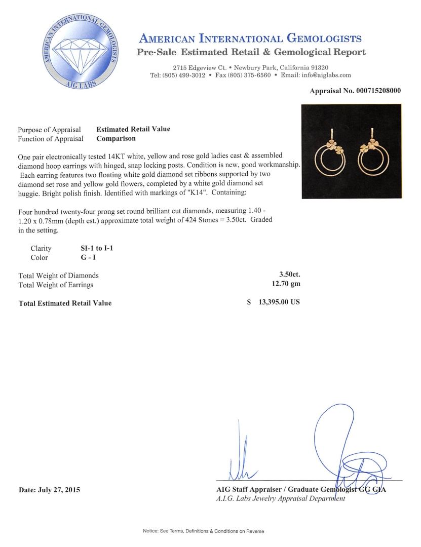 One pair electronically tested 14KT white, yellow and rose gold ladies cast & assembled diamond hoop earrings with hinged, snap locking posts. Each earring features two floating white gold diamond set ribbons supported by two diamond set rose and yellow gold flowers, completed by a white gold diamond set huggie. Bright polish finish. Identified with markings of "K14". Condition is new, good workmanship. Containing: Four Hundred Twenty-Four prong set round brilliant cut diamonds, measuring 1.40 - 1.20 x 0.78mm (depth est.) approximate total weight of 424 Stones = 3.50ct. Graded in the setting. Clarity: SI-1 to I-1. Color: G - I. Total Weight of Diamonds 3.50ct. Total Weight of Earrings 12.70gm. AIG Appraised at $13,395.00.
