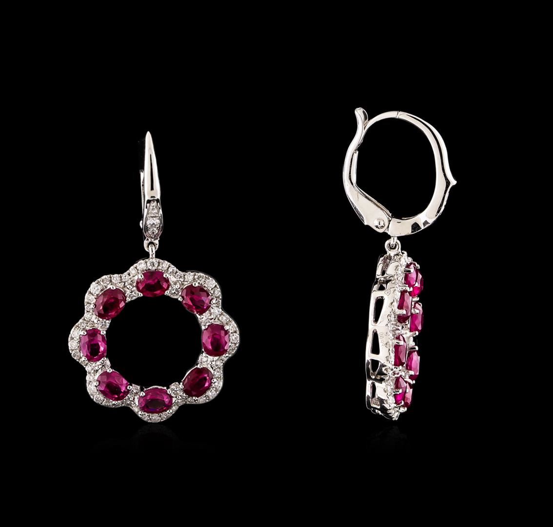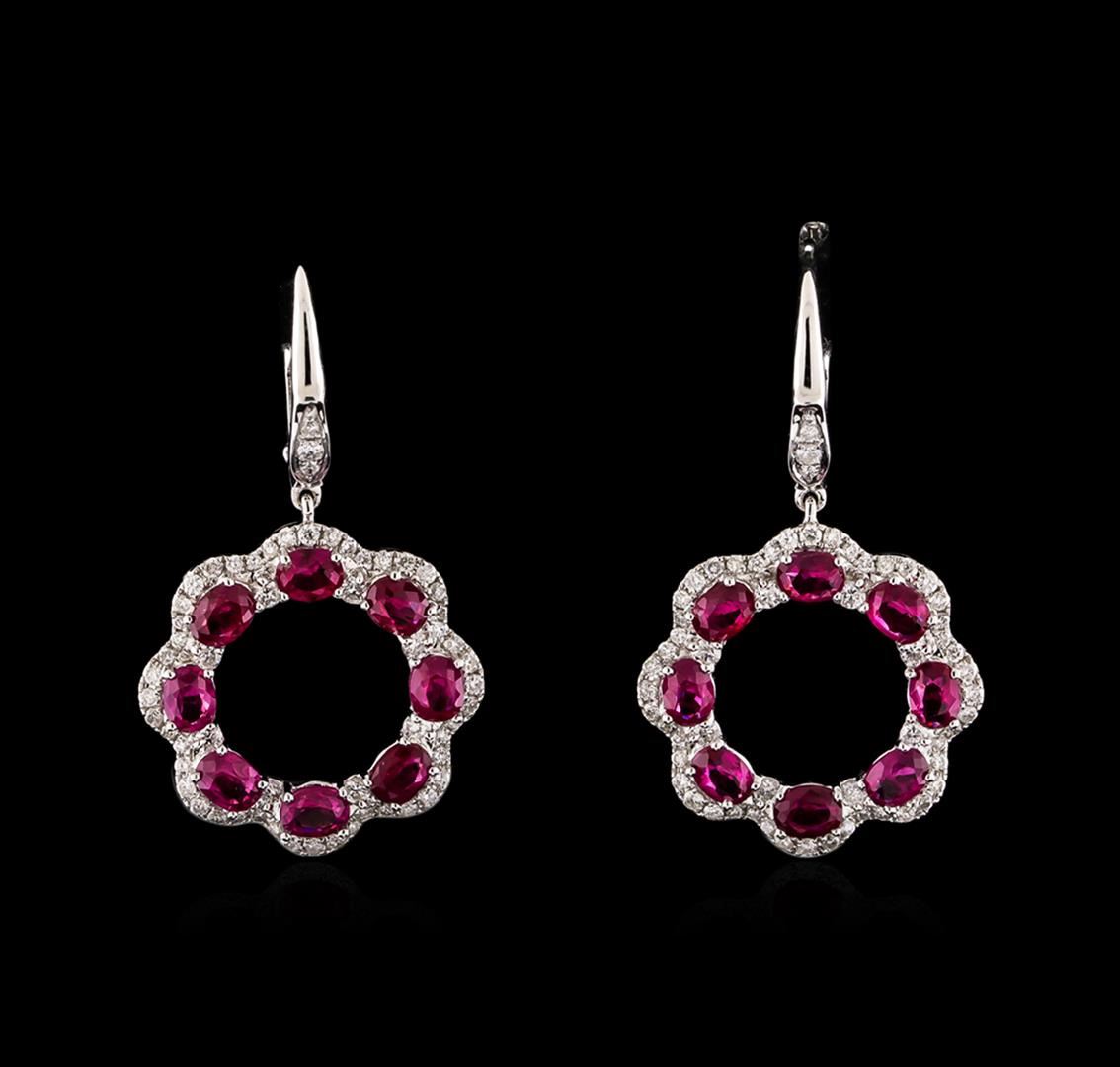 One pair electronically tested 18KT white gold lady's combination cast & assembled dangle circle earrings with hinged clip backs with a bright polish finish. The featured lady's dangle earrings have a length of 35 millimeters. Identified with markings of "750". Condition is new, good workmanship. Containing: Sixteen prong set oval modified brilliant cut natural rubies, measuring 4.00 x 2.95 x 1.92mm, 10%. bulge factor, approximate total weight of 3.50ct., clarity is slightly included, type II, medium dark, moderately strong, slightly purplish red color, (GIA slpR 6/4), cut is good. Transmitting light with a minimum of distortion, transparent. Colored gemstones are presumed to have been subjected to commonly used enhancement processes. Graded in the setting. Eighteen prong set round brilliant cut diamonds, measuring 1.50 - 1.40 x 0.87mm (depth est.) approximate total weight of 18 Stones = 0.20ct. Graded in the setting. Clarity: SI-1 to SI-2 . Color: H - I. Cut Good One Hundred prong set round brilliant cut diamonds, measuring 1.30 - 1.20 x 0.76mm (depth est.) approximate total weight of 100 Stones = 0.73ct. Graded in the setting. Clarity: SI-1 to I-1 . Color: H - I. Cut Good. Total Weight of Colored Stones 3.50ct.. Total Weight of Diamonds 0.93ct.. Total Weight of Earrings 7.60gm. GAS Appraised at $7,745.00.