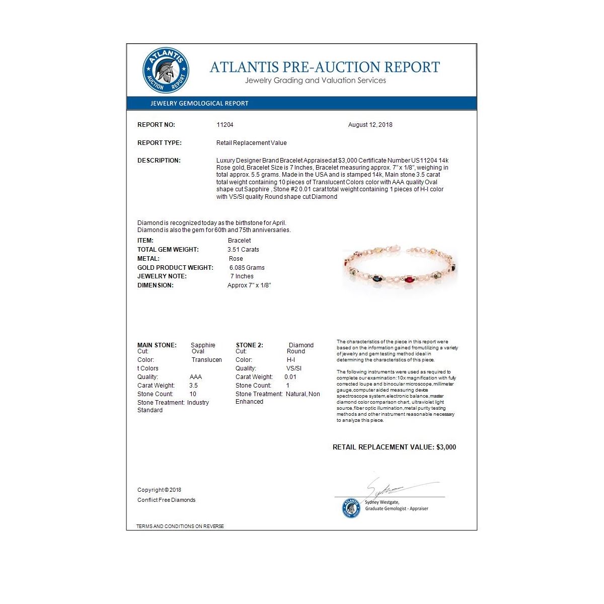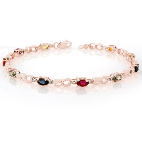 REF-45A3X -11204 ---- 3.51 CTW Multi-Sapphire & Diamond Bracelet 14K Rose Gold ---- Luxury Designer Brand Bracelet Appraised at $3,000 Certificate Number US11204 14k Rose gold, Bracelet Size is 7 Inches, Bracelet measuring approx. 7" x 1/8", weighing in total approx. 5.5 grams. Made in the USA and is stamped 14k, Main stone 3.5 carat total weight containing 10 pieces of Translucent Colors color with AAA quality Oval shape cut Sapphire , Stone #2 0.01 carat total weight containing 1 pieces of H-I color with VS/SI quality Round shape cut Diamond
