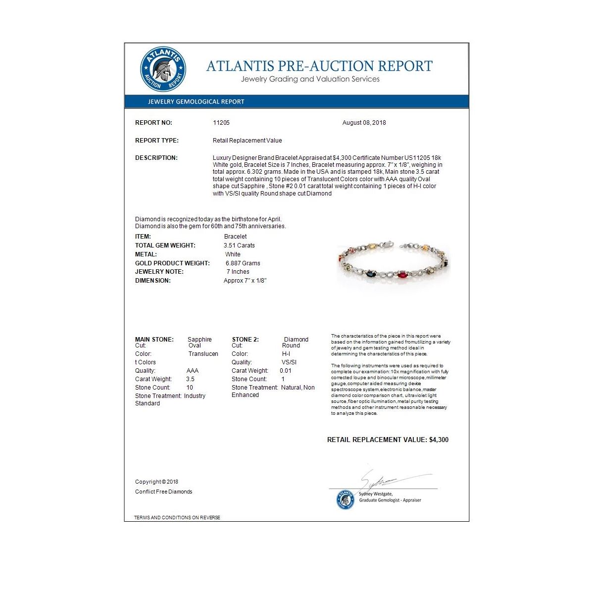 REF-65T5M -11205 ---- 3.51 CTW Multi-Sapphire & Diamond Bracelet 18K White Gold ---- Luxury Designer Brand Bracelet Appraised at $4,300 Certificate Number US11205 18k White gold, Bracelet Size is 7 Inches, Bracelet measuring approx. 7" x 1/8", weighing in total approx. 6.302 grams. Made in the USA and is stamped 18k, Main stone 3.5 carat total weight containing 10 pieces of Translucent Colors color with AAA quality Oval shape cut Sapphire , Stone #2 0.01 carat total weight containing 1 pieces of H-I color with VS/SI quality Round shape cut Diamond