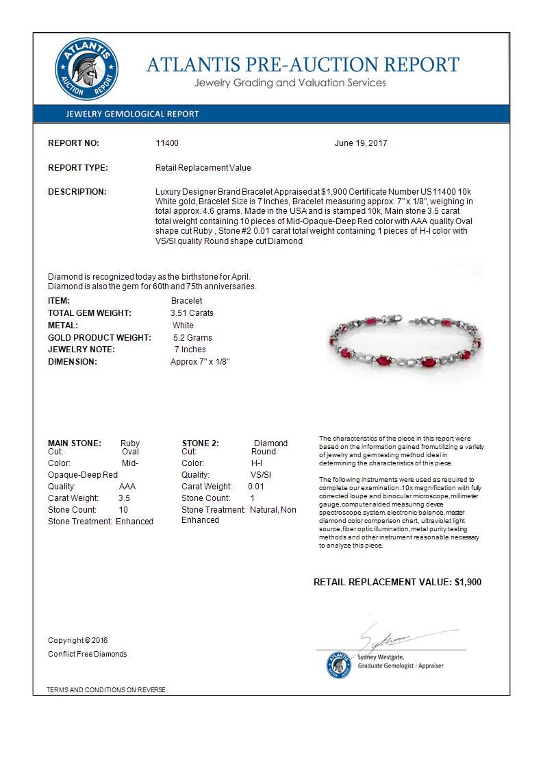 3.51 CTW Ruby & Diamond Bracelet 10K White Gold ---- Luxury Designer Brand Bracelet Appraised Retail Price at $1,900 ---- SKU Number US11400 10k White gold Bracelet Size is 7 Inches, Bracelet measuring approx. 7" x 1/8", weighing in total approx. 4.6 grams. Made in the USA and is stamped 10k, Main stone 3.5 carat total weight containing 10 pieces of Mid-Opaque-Deep Red color with AAA quality Oval shape cut Ruby , Stone #2 0.01 carat total weight containing 1 pieces of H-I color with VS/SI quality Round shape cut