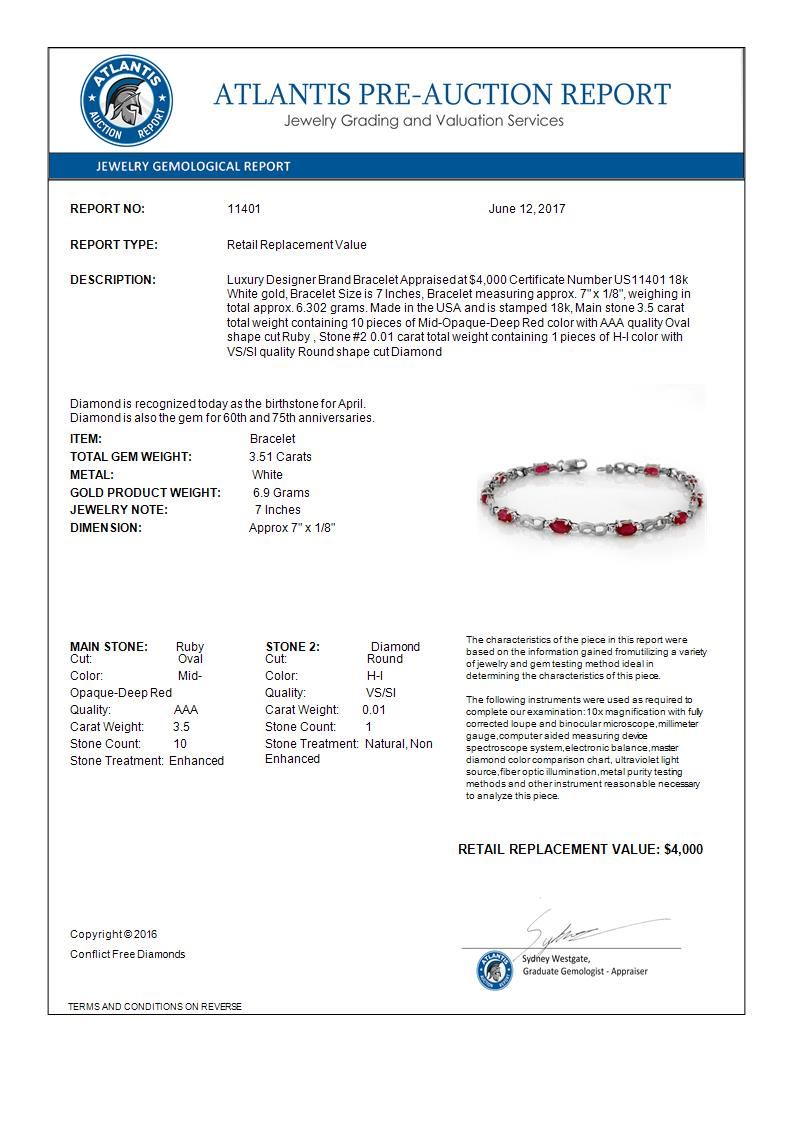 3.51 CTW Ruby & Diamond Bracelet 18K White Gold ---- Luxury Designer Brand Bracelet Appraised Retail Price at $4,000 ---- SKU Number US11401 18k White gold Bracelet Size is 7 Inches, Bracelet measuring approx. 7" x 1/8", weighing in total approx. 6.302 grams. Made in the USA and is stamped 18k, Main stone 3.5 carat total weight containing 10 pieces of Mid-Opaque-Deep Red color with AAA quality Oval shape cut Ruby , Stone #2 0.01 carat total weight containing 1 pieces of H-I color with VS/SI quality Round shape cut