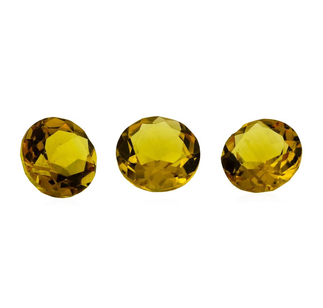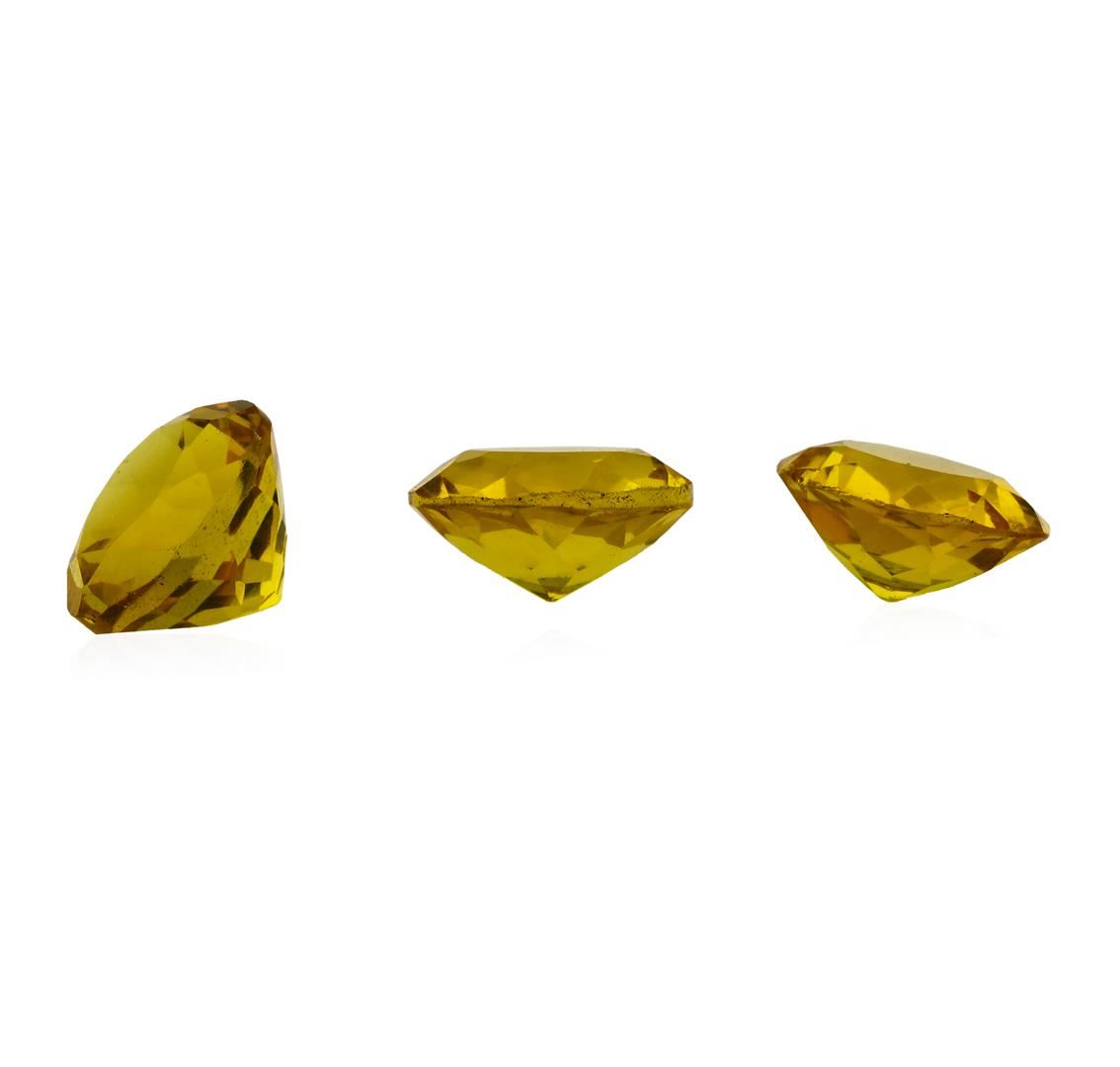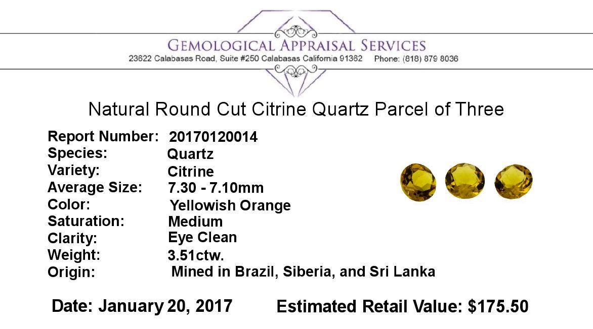 One natural round cut citrine quartz parcel of three with an exact weight of 3.51ctw., clarity is eye clean, yellowish orange, medium. Gemological Appraisals Services estimates the retail value at $175.5 GAS Appraised.