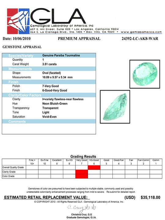 Excellent blue green color RARE copper-bearing specimen oval cut: COPPER in tourmaline is rare and highly prized, it makes the stone color much more vivid (sometimes neon-like) and causes the stone to mimick the reflectivity of diamond; lab quality evaluation 7; treatment as noted; Gem Guide wholesale $5265-$8775; full retail appraisal $35118; full lab evaluation included