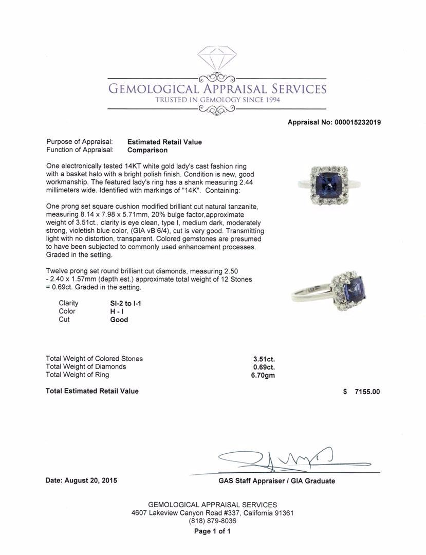 One electronically tested 14KT white gold lady's cast fashion ring with a basket halo with a bright polish finish. The featured lady's ring has a shank measuring 2.44 millimeters wide. Identified with markings of "14K". Condition is new, good workmanship. Containing: One prong set square cushion modified brilliant cut natural tanzanite, measuring 8.14 x 7.98 x 5.71mm, 20% bulge factor, approximate weight of 3.51ct., clarity is eye clean, type I, medium dark, moderately strong, violetish blue color, (GIA vB 6/4), cut is very good. Transmitting light with no distortion, transparent. Colored gemstones are presumed to have been subjected to commonly used enhancement processes. Graded in the setting. Twelve prong set round brilliant cut diamonds, measuring 2.50 - 2.40 x 1.57mm (depth est.) approximate total weight of 12 Stones = 0.69ct. Graded in the setting. Clarity: SI-2 to I-1. Color: H - I. Cut Good. Total Weight of Colored Stones 3.51ct. Total Weight of Diamonds 0.69ct. Total Weight of Ring 6.70gm. GAS Appraised at $7,155.00.