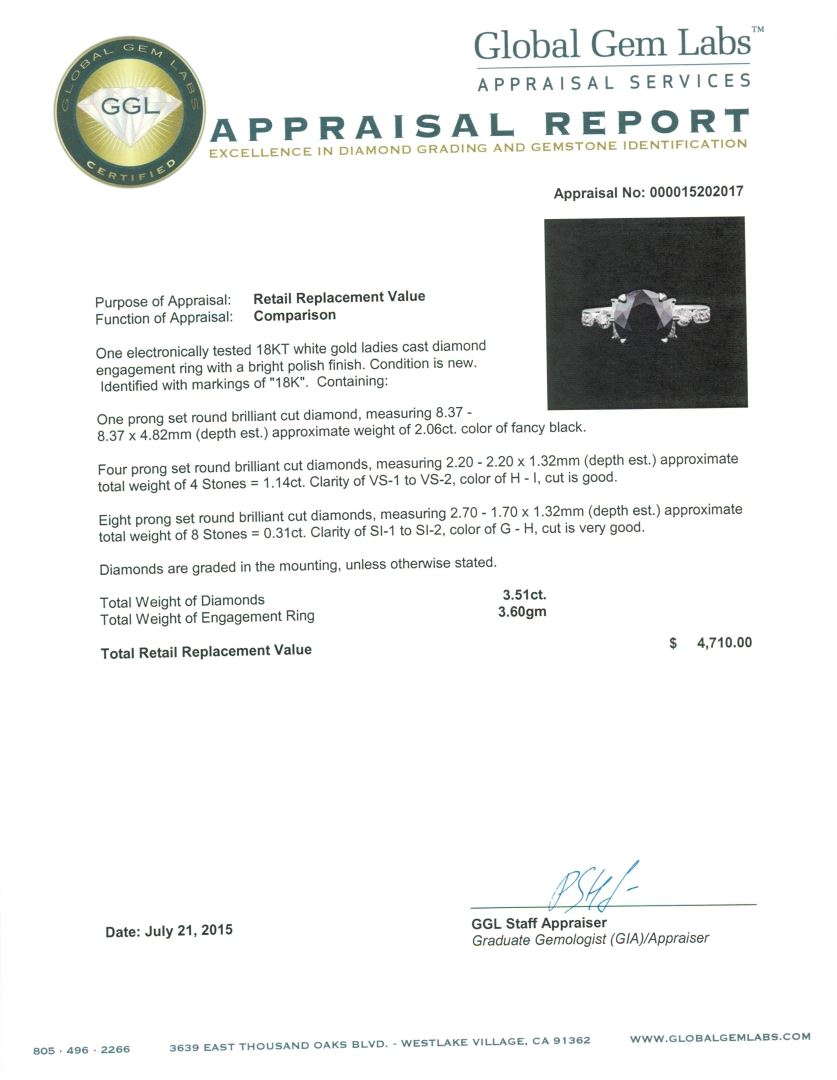 One electronically tested 18KT white gold ladies cast diamond engagement ring with a bright polish finish. Identified with markings of "18K". Condition is new. Containing: One prong set round brilliant cut diamond, measuring 8.37 - 8.37 x 4.82mm (depth est.) approximate weight of 2.06ct. color of fancy black. Four prong set round brilliant cut diamonds, measuring 2.20 - 2.20 x 1.32mm (depth est.) approximate total weight of 4 Stones = 1.14ct. Clarity: VS-1 to VS-2. Color: H - I, Cut is Good. Eight prong set round brilliant cut diamonds, measuring 2.70 - 1.70 x 1.32mm (depth est.) approximate total weight of 8 Stones = 0.31ct. Clarity: SI-1 to SI-2. Color: G - H, Cut is Very Good. Diamonds are graded in the mounting, unless otherwise stated. Total Weight of Diamonds 3.51ct. Total Weight of Engagement Ring 3.60gm. GGL Appraised at $4,710.00.