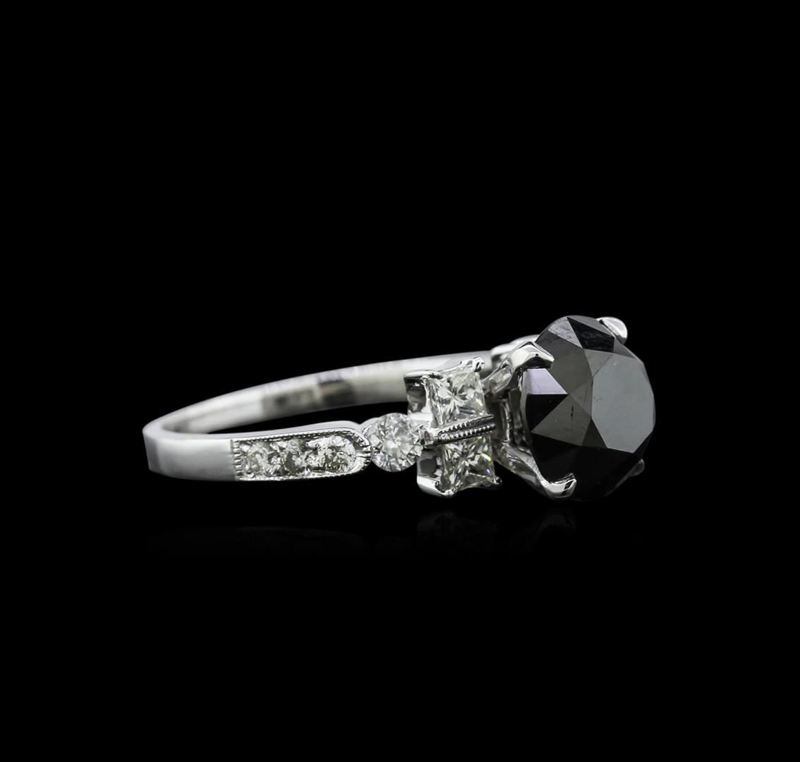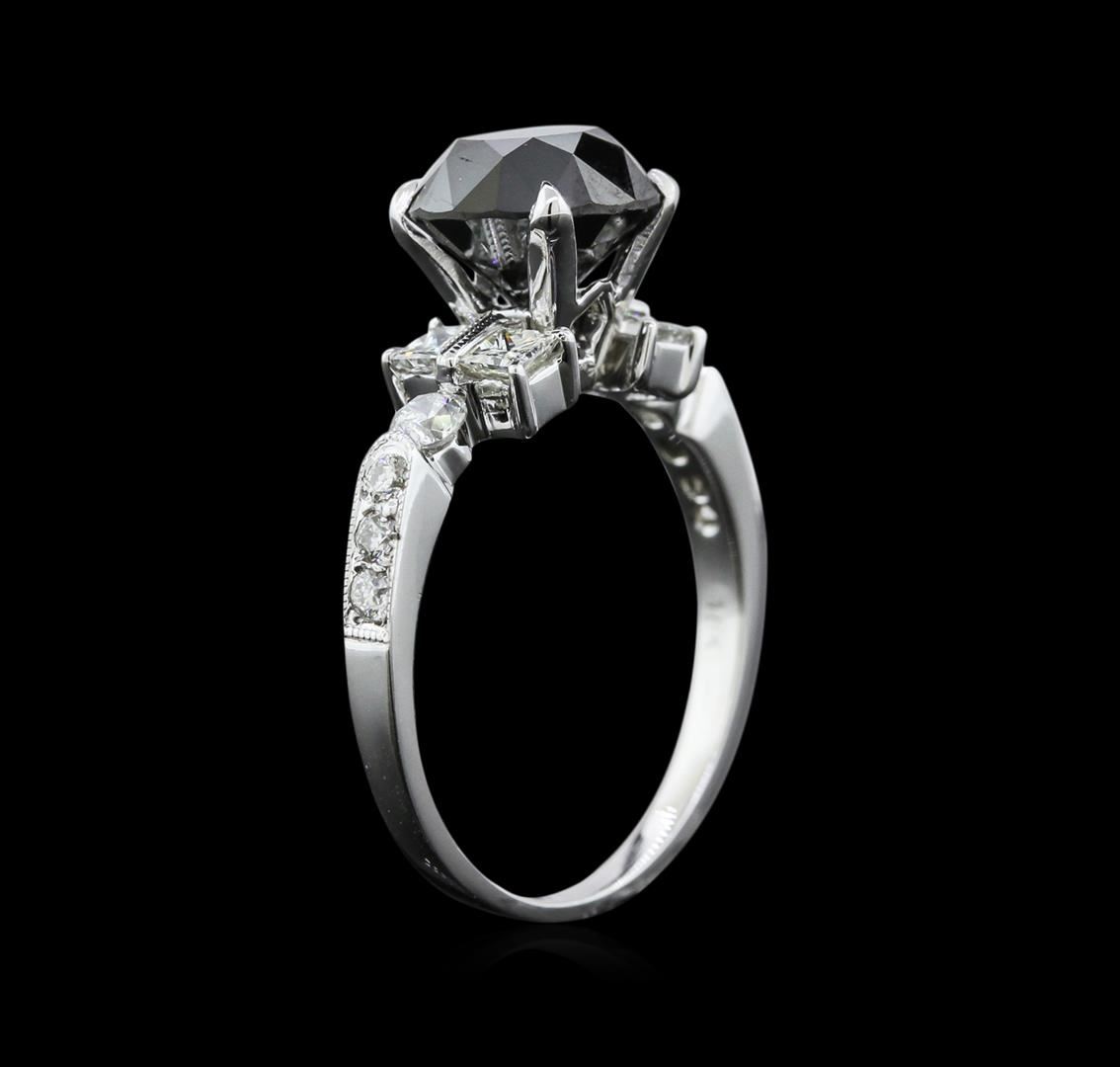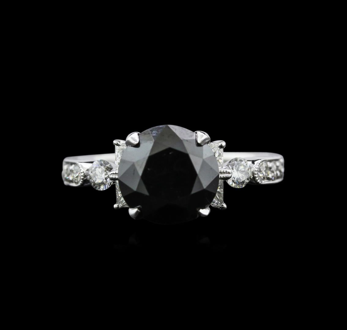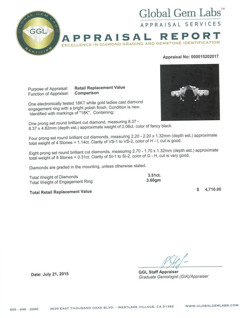 One electronically tested 18KT white gold ladies cast diamond engagement ring with a bright polish finish. Identified with markings of "18K". Condition is new. Containing: One prong set round brilliant cut diamond, measuring 8.37 - 8.37 x 4.82mm (depth est.) approximate weight of 2.06ct. color of fancy black. Four prong set round brilliant cut diamonds, measuring 2.20 - 2.20 x 1.32mm (depth est.) approximate total weight of 4 Stones = 1.14ct. Clarity: VS-1 to VS-2. Color: H - I, Cut is Good. Eight prong set round brilliant cut diamonds, measuring 2.70 - 1.70 x 1.32mm (depth est.) approximate total weight of 8 Stones = 0.31ct. Clarity: SI-1 to SI-2. Color: G - H, Cut is Very Good. Diamonds are graded in the mounting, unless otherwise stated. Total Weight of Diamonds 3.51ct. Total Weight of Engagement Ring 3.60gm. GGL Appraised at $4,710.00.