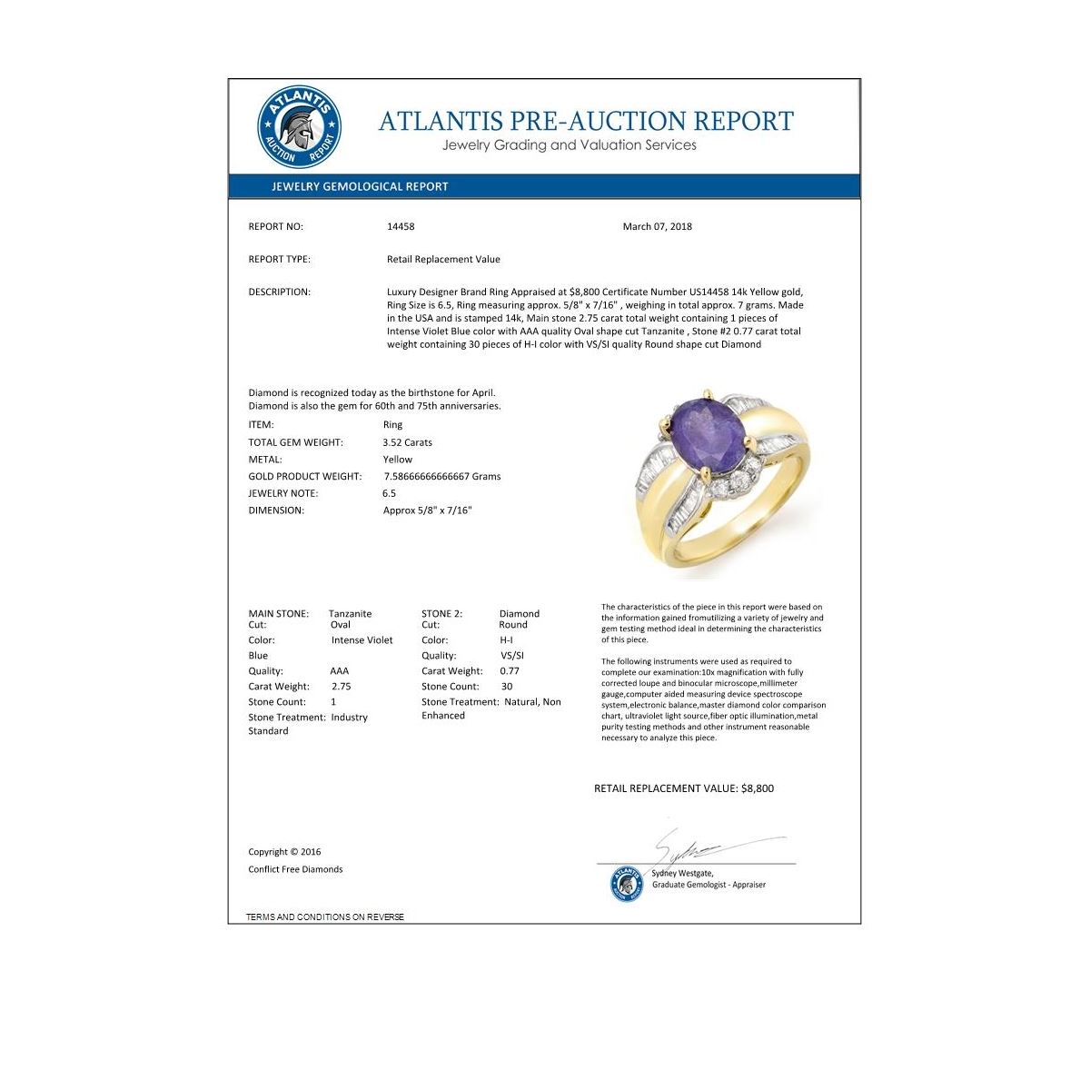 REF-114A2X -14458 ---- 3.52 CTW Tanzanite & Diamond Ring 14K Yellow Gold ---- Luxury Designer Brand Ring Appraised at $8,800 Certificate Number US14458 14k Yellow gold, Ring Size is 6.5, Ring measuring approx. 5/8" x 7/16" , weighing in total approx. 7 grams. Made in the USA and is stamped 14k, Main stone 2.75 carat total weight containing 1 pieces of Intense Violet Blue color with AAA quality Oval shape cut Tanzanite , Stone #2 0.77 carat total weight containing 30 pieces of H-I color with VS/SI quality Round shape cut Diamond