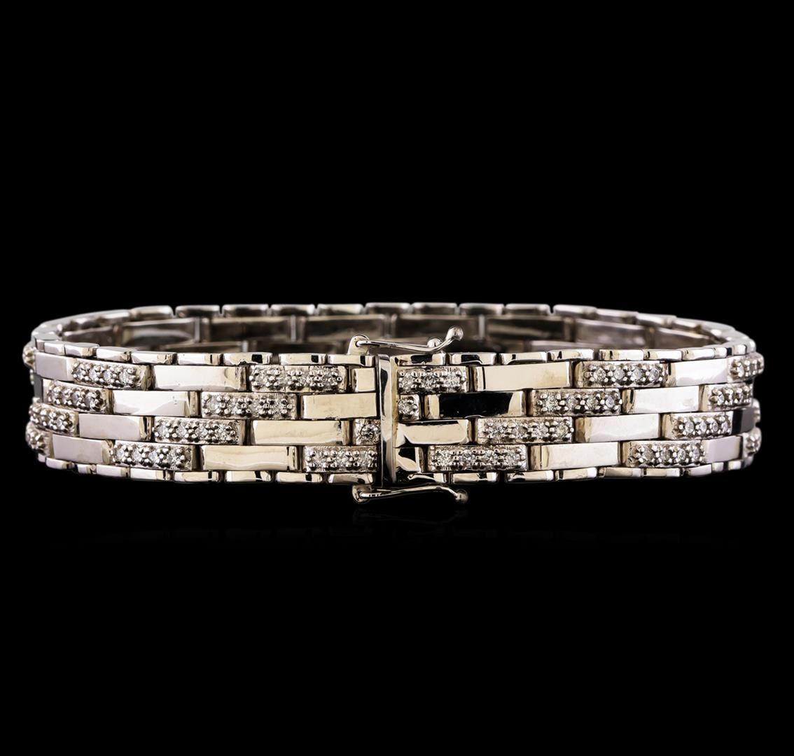 One electronically tested 14KT white gold man's combination cast & assembled fashion bracelet with a tongue clasp with foldover safety with a bright polish finish. The featured man's bracelet has a linked motif and measures 8 inches in length. Identified with markings of '14K'. Condition is new, good workmanship. Containing: One Hundred Fifty-Two prong set round brilliant cut diamonds, measuring 1.90 - 1.80 x 1.11mm (depth est.) approximate total weight of 152 Stones = 3.52ct. Graded in the setting. Clarity SI-1 to SI-2. Color: G - I Cut Good. Total Weight of Diamonds 3.52ct.. Total Weight of Bracelet 66.70gm. GAS Appraised at $17,380.00.