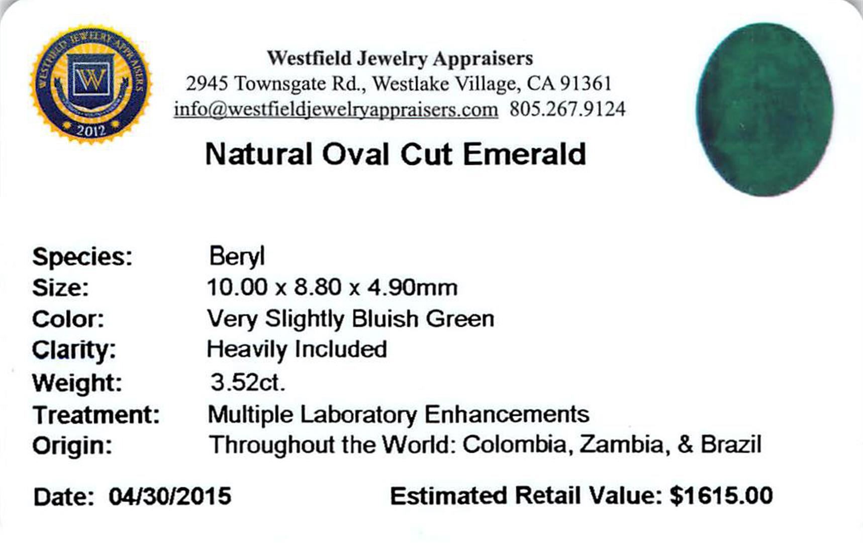 One oval cut natural emerald, measuring 11.00 x 8.80 x 4.90mm, exact weight 3.52ct., clarity is heavily included, type III, medium dark, very slightly grayish, very slightly bluish green color, (GIA vslbG 6/3), cut is good. Westfield Appraised at $1,615.00.