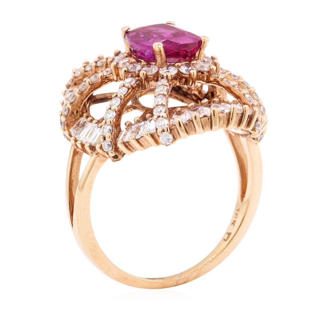 One electronically tested 14KT rose gold lady's cast fashion ring with a starburst oval halo with a bright polish finish. The featured lady's ring has a shank measuring 1.30 millimeters wide. Identified with markings of '14K'. Condition is new, good workmanship. Containing: One prong set rectangular cushion modified mixed cut natural purple sapphire, measuring 7.56 x 6.76 x 4.56mm, (depth est.) approximate weight of 2.09ct., clarity is eye clean, medium dark, strong, purple red color, (GIA PR 6/5), cut is very good. Transmitting light with no distortion, transparent. Colored gemstones are presumed to have been subjected to commonly used enhancement processes. Indications of laboratory high temperature heat treatment. Gradedin the setting in the GIA Laboratory, Report #6173231034. Thirty-Two prong set baguette cut (tapered) diamonds, measuring from 2.00 x 1.20 x 1.02mm (depth est.) to 2.20 x 1.50 x 1.28mm (depth est.) approximate total weight of 32 Stones = 0.89ct. Graded in the setting. Color H - I Clarity VS-2 to SI-1 Cut Good Fourteen prong set round brilliant cut diamonds, measuring 1.80 - 1.75 x 1.10mm (depth est.) approximate total weight of 14 Stones = 0.30ct. Graded in the setting. Color H - I Clarity SI-1 to SI-2 Cut Good Fifty-Six prong set round brilliant cut diamonds, measuring 1.10 - 1.00 x 0.65mm (depth est.) approximate total weight of 56 Stones = 0.24ct. Graded in the setting. Color H - I Clarity SI-1 to SI-2 Cut Good. Total Weight of Colored Stones 2.09ct.. Total Weight of Diamonds 1.43ct.. Total Weight of Ring 5.90gm GAS Appraised at  $13710.00. GAS Appraised.