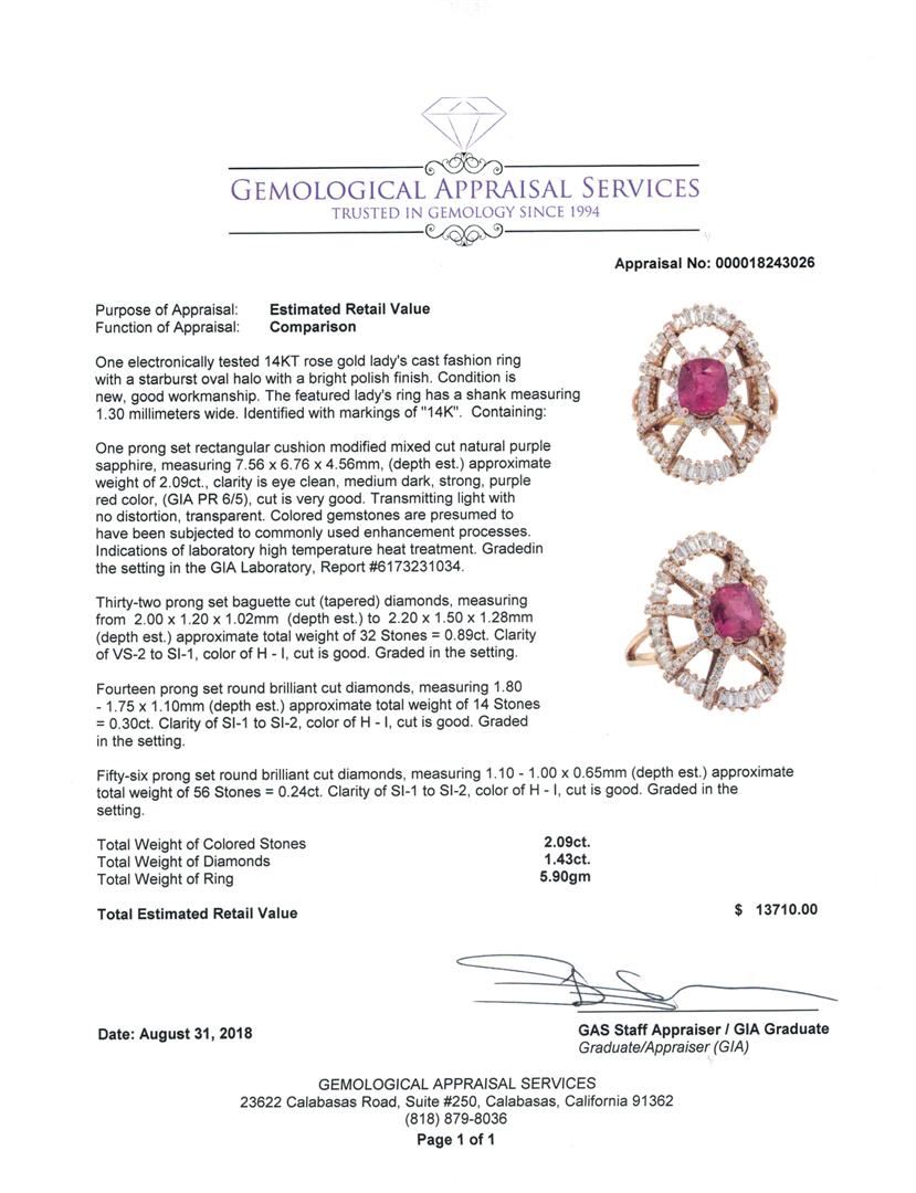 One electronically tested 14KT rose gold lady's cast fashion ring with a starburst oval halo with a bright polish finish. The featured lady's ring has a shank measuring 1.30 millimeters wide. Identified with markings of '14K'. Condition is new, good workmanship. Containing: One prong set rectangular cushion modified mixed cut natural purple sapphire, measuring 7.56 x 6.76 x 4.56mm, (depth est.) approximate weight of 2.09ct., clarity is eye clean, medium dark, strong, purple red color, (GIA PR 6/5), cut is very good. Transmitting light with no distortion, transparent. Colored gemstones are presumed to have been subjected to commonly used enhancement processes. Indications of laboratory high temperature heat treatment. Gradedin the setting in the GIA Laboratory, Report #6173231034. Thirty-Two prong set baguette cut (tapered) diamonds, measuring from 2.00 x 1.20 x 1.02mm (depth est.) to 2.20 x 1.50 x 1.28mm (depth est.) approximate total weight of 32 Stones = 0.89ct. Graded in the setting. Color H - I Clarity VS-2 to SI-1 Cut Good Fourteen prong set round brilliant cut diamonds, measuring 1.80 - 1.75 x 1.10mm (depth est.) approximate total weight of 14 Stones = 0.30ct. Graded in the setting. Color H - I Clarity SI-1 to SI-2 Cut Good Fifty-Six prong set round brilliant cut diamonds, measuring 1.10 - 1.00 x 0.65mm (depth est.) approximate total weight of 56 Stones = 0.24ct. Graded in the setting. Color H - I Clarity SI-1 to SI-2 Cut Good. Total Weight of Colored Stones 2.09ct.. Total Weight of Diamonds 1.43ct.. Total Weight of Ring 5.90gm GAS Appraised at $13710.00. GAS Appraised.