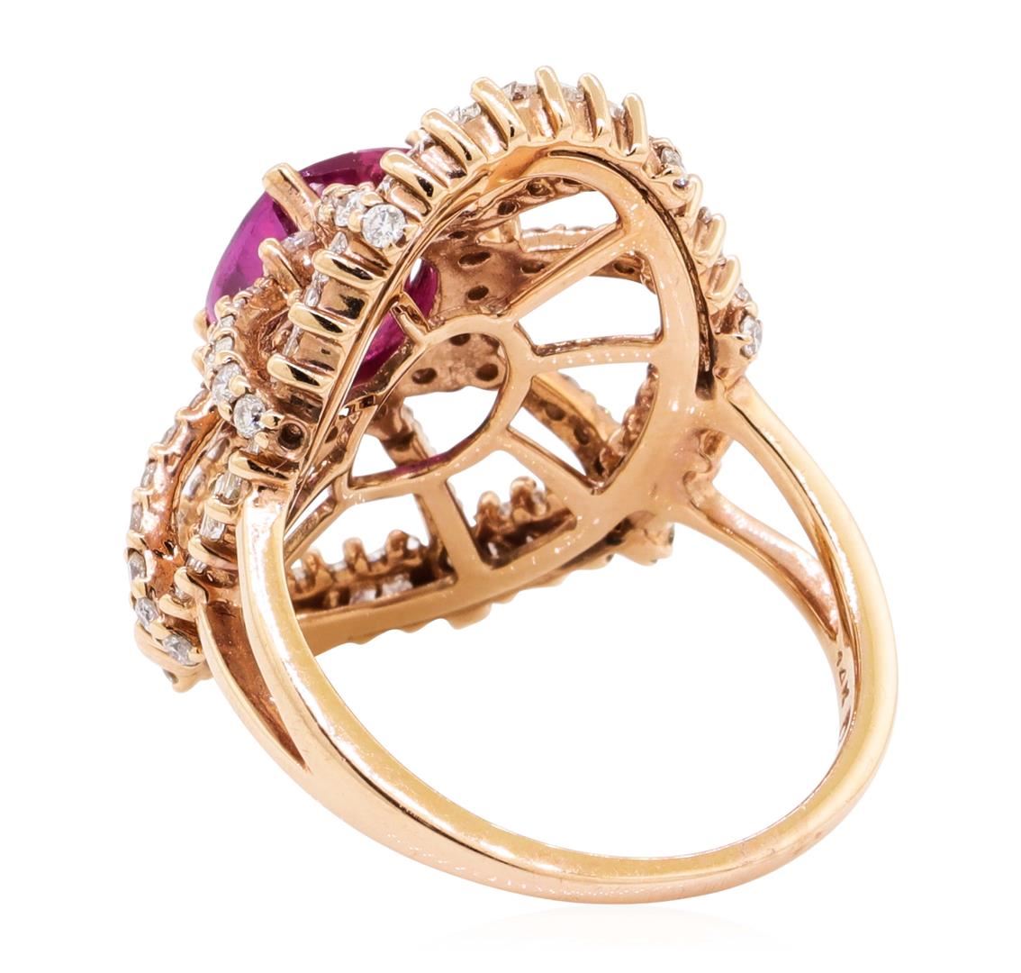 One electronically tested 14KT rose gold lady's cast fashion ring with a starburst oval halo with a bright polish finish. The featured lady's ring has a shank measuring 1.30 millimeters wide. Identified with markings of '14K'. Condition is new, good workmanship. Containing: One prong set rectangular cushion modified mixed cut natural purple sapphire, measuring 7.56 x 6.76 x 4.56mm, (depth est.) approximate weight of 2.09ct., clarity is eye clean, medium dark, strong, purple red color, (GIA PR 6/5), cut is very good. Transmitting light with no distortion, transparent. Colored gemstones are presumed to have been subjected to commonly used enhancement processes. Indications of laboratory high temperature heat treatment. Gradedin the setting in the GIA Laboratory, Report #6173231034. Thirty-Two prong set baguette cut (tapered) diamonds, measuring from 2.00 x 1.20 x 1.02mm (depth est.) to 2.20 x 1.50 x 1.28mm (depth est.) approximate total weight of 32 Stones = 0.89ct. Graded in the setting. Color H - I Clarity VS-2 to SI-1 Cut Good Fourteen prong set round brilliant cut diamonds, measuring 1.80 - 1.75 x 1.10mm (depth est.) approximate total weight of 14 Stones = 0.30ct. Graded in the setting. Color H - I Clarity SI-1 to SI-2 Cut Good Fifty-Six prong set round brilliant cut diamonds, measuring 1.10 - 1.00 x 0.65mm (depth est.) approximate total weight of 56 Stones = 0.24ct. Graded in the setting. Color H - I Clarity SI-1 to SI-2 Cut Good. Total Weight of Colored Stones 2.09ct.. Total Weight of Diamonds 1.43ct.. Total Weight of Ring 5.90gm GAS Appraised at $13710.00. GAS Appraised.