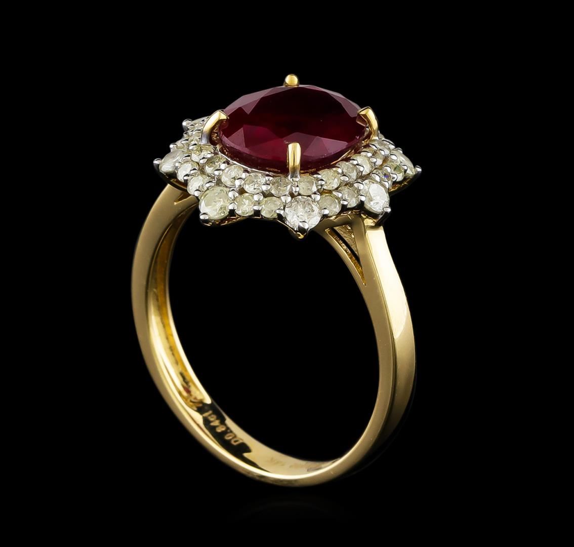 Fourteen karat (14K) yellow gold ruby and diamond ring. An Oval cut ruby corundum gemstone is prong mounted in the center of the ring. Round brilliant cut diamonds accent the ring around the center gemstone. The ring is cast stamped "14K" and has a gross weight of 3.5 grams. Diamond(s): Shape: Round brilliant cut. Weight: 0.84 carat. Average clarity: I1-I2. Average color I-K. Symmetry: Very good. Polish: Very good. Gemstone(s): Gemstone: Ruby Corundum. Nature: natural. Shape: Oval, faceted. Quantity: 1, mounted. Weight: 3.52 carat. Dimensions: Length-10.16 mm. ; Width- 8.10 mm. Bulge: Visible. Clarity: I1, type 3. Color: Red. Symmetry: Very Good. Color intensity: Medium. Transparency: Transparent. Tone: Dark. Enhancements: Indications of high temperature heat treatment, with glass and flux additives. Metal(s): Metal: Gold, stamped. Purity: 14K. Color: Yellow. Condition: Excellent. Finish: High polish. GGA Appraised at $3,165.00.