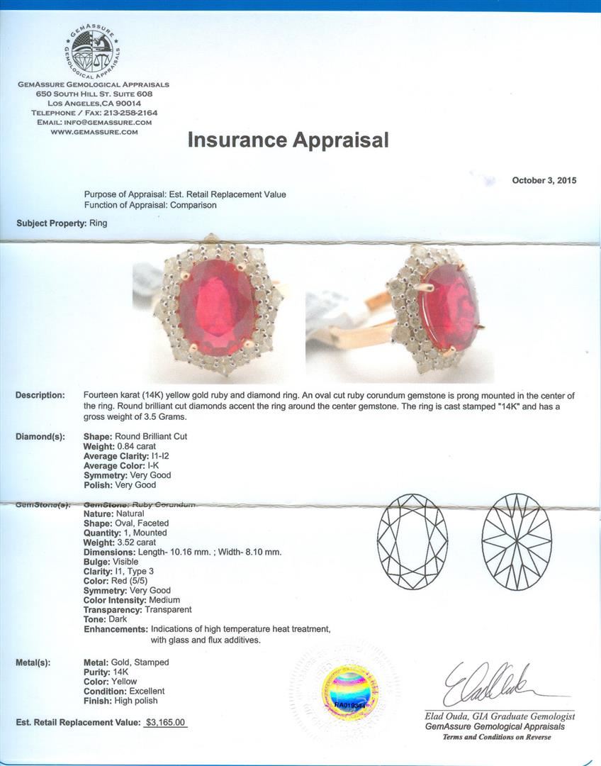 Fourteen karat (14K) yellow gold ruby and diamond ring. An Oval cut ruby corundum gemstone is prong mounted in the center of the ring. Round brilliant cut diamonds accent the ring around the center gemstone. The ring is cast stamped "14K" and has a gross weight of 3.5 grams. Diamond(s): Shape: Round brilliant cut. Weight: 0.84 carat. Average clarity: I1-I2. Average color I-K. Symmetry: Very good. Polish: Very good. Gemstone(s): Gemstone: Ruby Corundum. Nature: natural. Shape: Oval, faceted. Quantity: 1, mounted. Weight: 3.52 carat. Dimensions: Length-10.16 mm. ; Width- 8.10 mm. Bulge: Visible. Clarity: I1, type 3. Color: Red. Symmetry: Very Good. Color intensity: Medium. Transparency: Transparent. Tone: Dark. Enhancements: Indications of high temperature heat treatment, with glass and flux additives. Metal(s): Metal: Gold, stamped. Purity: 14K. Color: Yellow. Condition: Excellent. Finish: High polish. GGA Appraised at $3,165.00.
