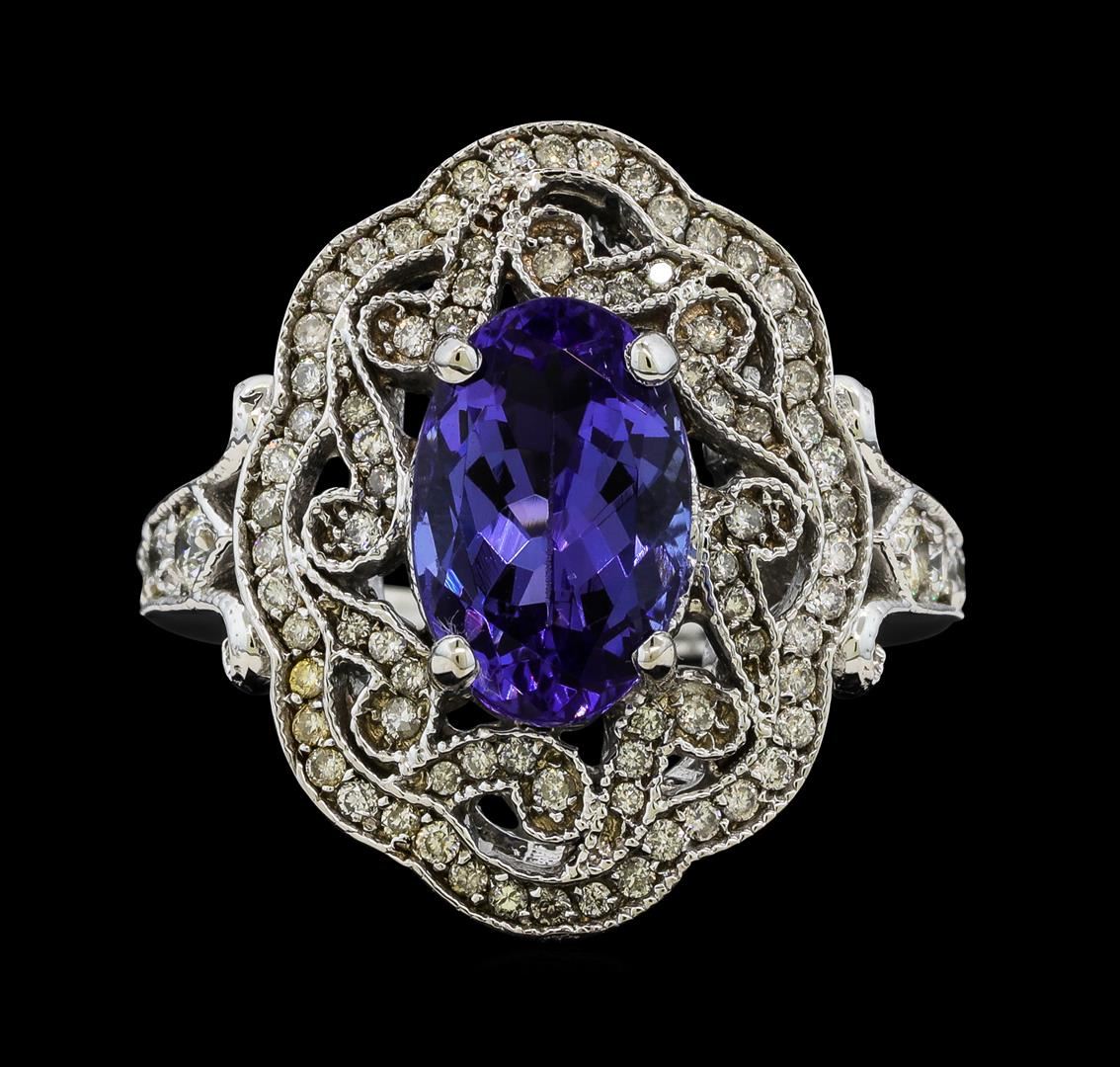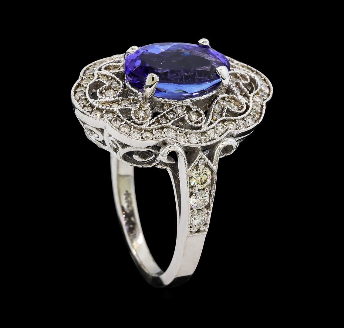 One electronically tested 14KT white gold lady's cast vintage style fashion ring with a scalloped basket halo with a bright polish with milgrain detailing finish. The featured lady's ring has a shank measuring 1.90 millimeters wide. Identified with markings of 'K14'. Condition is new, good workmanship. Containing: One prong set oval modified brilliant cut natural tanzanite, measuring 11.43 x 7.35 x 5.26mm, (depth est.) 13%. bulge factor, approximate weight of 3.52ct., clarity is eye clean, medium, very slightly grayish, violetish blue color, (GIA vB 5/3), cut is very good. Transmitting light with no distortion, transparent. Colored gemstones are presumed to have been subjected to commonly used enhancement processes. Graded in the setting. Six prong set round brilliant cut diamonds, measuring 2.40 - 2.10 x 1.40mm (depth est.) approximate total weight of 6 Stones = 0.26ct. Graded in the setting. Clarity VS-2 to SI-2. Color: H - I Cut Good Fifty-Four prong set round brilliant cut diamonds, measuring 1.20 - 1.15 x 0.73mm (depth est.) approximate total weight of 54 Stones = 0.33ct. Graded in the setting. Clarity SI-1 to I-2. Color: H - J Cut Good Twenty-Four prong set round brilliant cut diamonds, measuring 1.10 - 1.05 x 0.67mm (depth est.) approximate total weight of 24 Stones = 0.12ct. Graded in the setting. Clarity SI-1 to I-1. Color: H - I Cut Good. Total Weight of Colored Stones 3.52ct.. Total Weight of Diamonds 0.71ct.. Total Weight of Ring 8.30gm. GAS Appraised at $8,995.00.