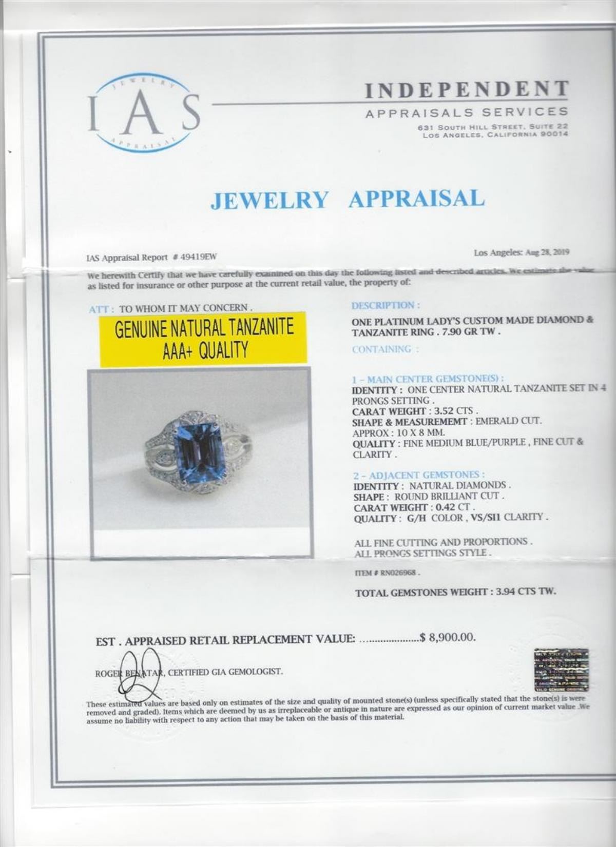 One 3.52ct Tanzanite and Diamond Ring - 14KT White Gold. IAS certified. See Appraisal for more details.