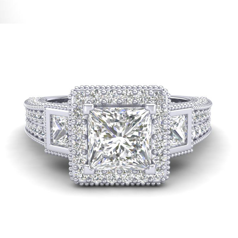 3.53 CTW Princess VS/SI Diamond Micro Pave 3 Stone Ring 18K White Gold ---- Luxury Designer Brand 3 stone ring Appraised Retail Price at $30,600 ---- SKU Number US37175 18k White gold 3 stone ring Size is 7, 3 stone ring measuring approx. Uniform, weighing in total approx. 14 grams. Made in the USA and is stamped 18k, Main stone 1.03 carat total weight containing 1 pieces of H-J color with VS/SI quality Princess shape cut Diamond , Stone #2 0.55 carat total weight containing 2 pieces of H-I color with VS/SI quality Princess shape cut