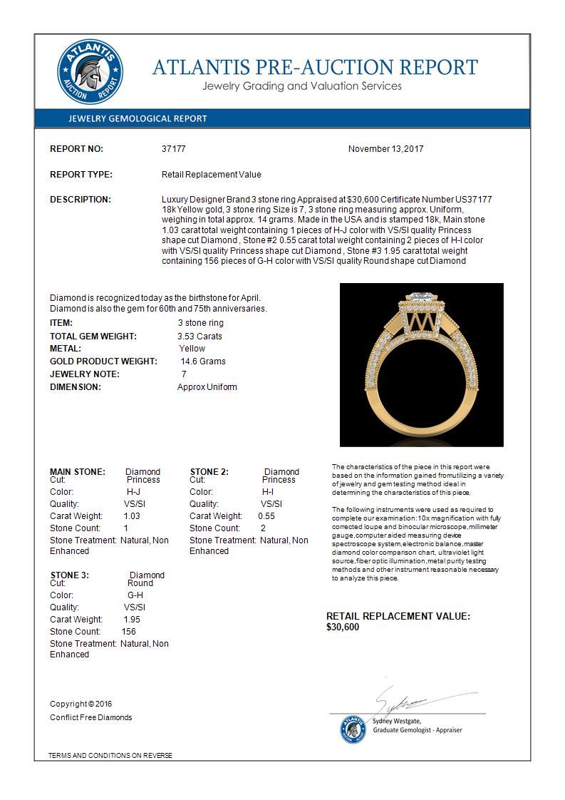 REF-618X2T -37177 ---- 3.53 CTW Princess VS/SI Diamond Micro Pave 3 Stone Ring 18K Yellow Gold ---- Luxury Designer Brand 3 stone ring Appraised at $30,600 Certificate Number US37177 18k Yellow gold, 3 stone ring Size is 7, 3 stone ring measuring approx. Uniform, weighing in total approx. 14 grams. Made in the USA and is stamped 18k, Main stone 1.03 carat total weight containing 1 pieces of H-J color with VS/SI quality Princess shape cut Diamond , Stone #2 0.55 carat total weight containing 2 pieces of H-I color with VS/SI quality Princess shape cut Diamond , Stone #3 1.95 carat total weight containing 156 pieces of G-H color with VS/SI quality Round shape cut Diamond
