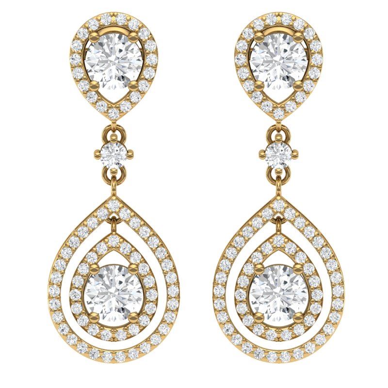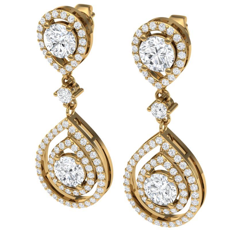 3.53 CTW Royalty Designer VS/SI Diamond Earrings 18K Yellow Gold ---- Luxury Designer Brand Earring Appraised Retail Price at $34,500 ---- SKU Number US39110 18K Yellow gold Earring Size is 32 Millimeter long, Earring measuring approx. 1 1/2 x 1/2 Inches, weighing in total approx. 7 grams. Made in the USA and is stamped 18K, Main stone 2.11 carat total weight containing 4 pieces of I-J color with VS/SI quality Round shape cut Diamond , Stone #2 1.42 carat total weight containing 140 pieces of G-H color with VS/SI quality Round shape cut