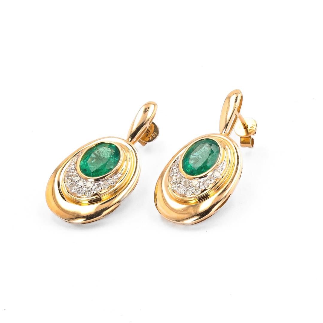 Fourteen karat (14K) yellow gold natural emerald beryl and diamond earrings. Two (2) oval brilliant cut natural emerald beryl gemstones are mounted in the center of the earrings. Round brilliant cut diamonds accent the earrings on the bottom of the center gemstones. The earrings have a gross weight of 9.2 Grams. Trademark is "Oscar Friedman". #NATURAL GEMSTONE# GEMSTONE: Emerald Beryl NATURE: Natural SHAPE: Oval Brilliant, Faceted Cut WEIGHT: 3.53 carat total (2pcs.) DIMENSIONS: 9.08 x 6.92 / 8.95 x 7.10mm CLARITY: Type 3 COLOR: Green (5/5) SYMMETRY: Excellent COLOR INTENSITY: Intense TRANSPARENCY: Transparent TONE: Dark #NATURAL DIAMOND# SHAPE: Round Brilliant Cut WEIGHT: 0.37 carat total (26pcs.) DIMENSIONS: 1.8 x 1.4mm AVERAGE CLARITY: SI1-SI2 AVERAGE COLOR: G-H SYMMETRY: Excellent POLISH: Excellent #METAL# METAL: Gold PURITY: 14K COLOR: Yellow CONDITION: Excellent FINISH: High Polish #LREF-4247