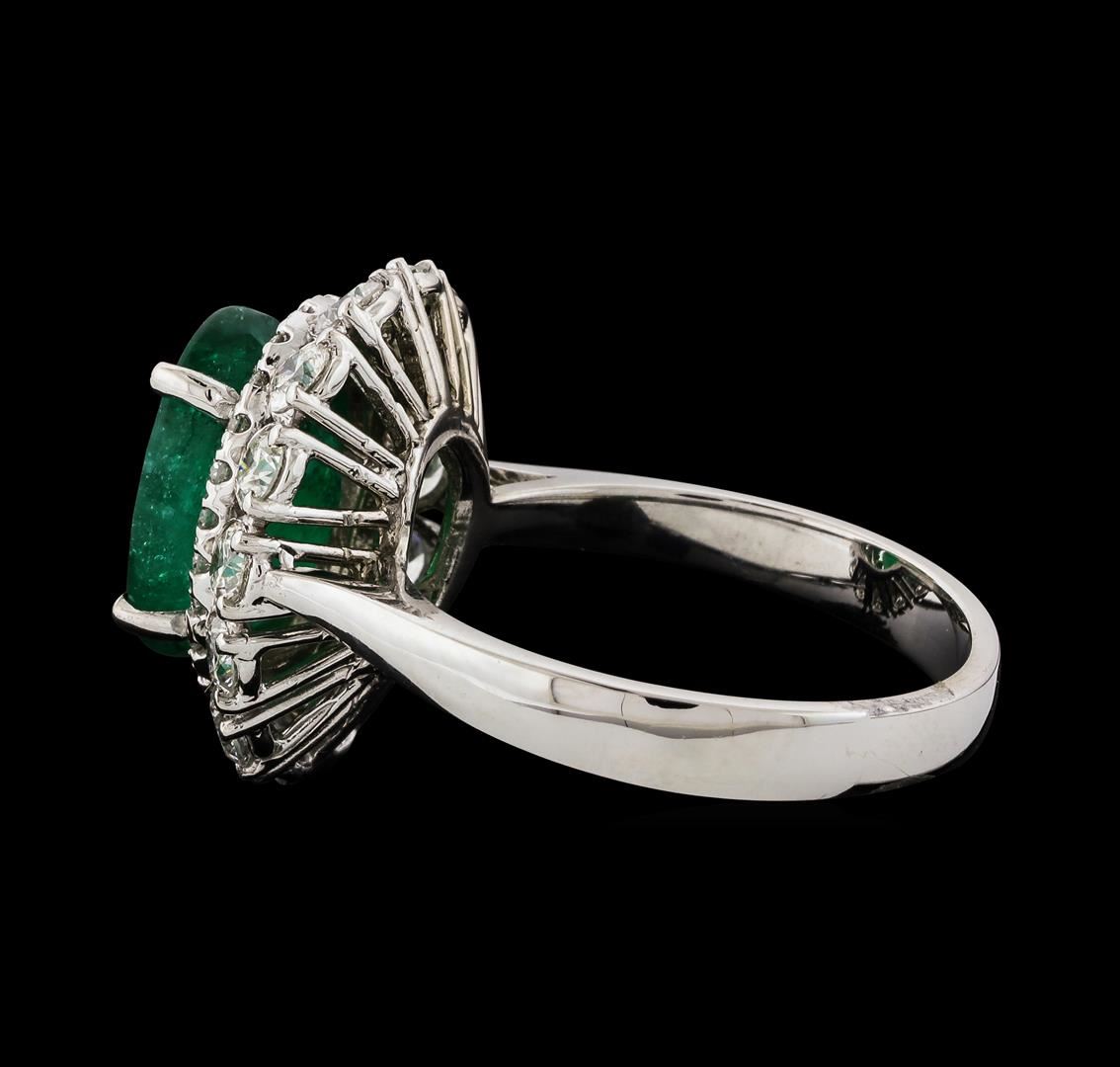 One electronically tested 14KT white gold lady's cast fashion ring with a double basket halo with a bright polish finish. The featured lady's ring has a shank measuring 3.00 millimeters wide. Identified with markings of 'K14'. Condition is new, good workmanship. Containing: One prong set oval modified mixed cut natural emerald, measuring 11.30 x 8.38 x 5.47mm, (depth est.) 15%. bulge factor, approximate weight of 3.53ct., clarity is heavily included, medium dark, moderately strong, green color, (GIA G 6/4), cut is good. Transmitting light somewhat diffusely, semi-transparent to translucent. Naturally occurring internal & external characteristics are present. Indications of oil residue. Colored gemstones are presumed to have been subjected to commonly used enhancement processes. Graded in the setting. Fourteen prong set round brilliant cut diamonds, measuring 2.75 - 2.65 x 1.67mm (depth est.) approximate total weight of 14 Stones = 1.05ct. Graded in the setting. Clarity SI-1 to I-1. Color: G - H Cut Good Twenty-Four prong set round brilliant cut diamonds, measuring 1.35 - 1.25 x 0.78mm (depth est.) approximate total weight of 24 Stones = 0.19ct. Graded in the setting. Clarity SI-1 to SI-2. Color: G - I Cut Good. Total Weight of Colored Stones 3.53ct.. Total Weight of Diamonds 1.24ct.. Total Weight of Ring 5.30gm. GAS Appraised at $6,075.00.