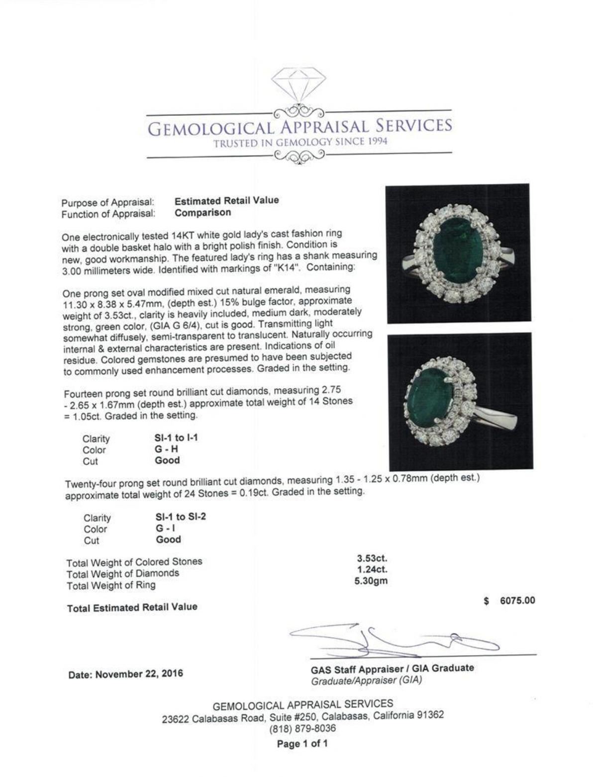 One electronically tested 14KT white gold lady's cast fashion ring with a double basket halo with a bright polish finish. The featured lady's ring has a shank measuring 3.00 millimeters wide. Identified with markings of 'K14'. Condition is new, good workmanship. Containing: One prong set oval modified mixed cut natural emerald, measuring 11.30 x 8.38 x 5.47mm, (depth est.) 15%. bulge factor, approximate weight of 3.53ct., clarity is heavily included, medium dark, moderately strong, green color, (GIA G 6/4), cut is good. Transmitting light somewhat diffusely, semi-transparent to translucent. Naturally occurring internal & external characteristics are present. Indications of oil residue. Colored gemstones are presumed to have been subjected to commonly used enhancement processes. Graded in the setting. Fourteen prong set round brilliant cut diamonds, measuring 2.75 - 2.65 x 1.67mm (depth est.) approximate total weight of 14 Stones = 1.05ct. Graded in the setting. Clarity SI-1 to I-1. Color: G - H Cut Good Twenty-Four prong set round brilliant cut diamonds, measuring 1.35 - 1.25 x 0.78mm (depth est.) approximate total weight of 24 Stones = 0.19ct. Graded in the setting. Clarity SI-1 to SI-2. Color: G - I Cut Good. Total Weight of Colored Stones 3.53ct.. Total Weight of Diamonds 1.24ct.. Total Weight of Ring 5.30gm. GAS Appraised.