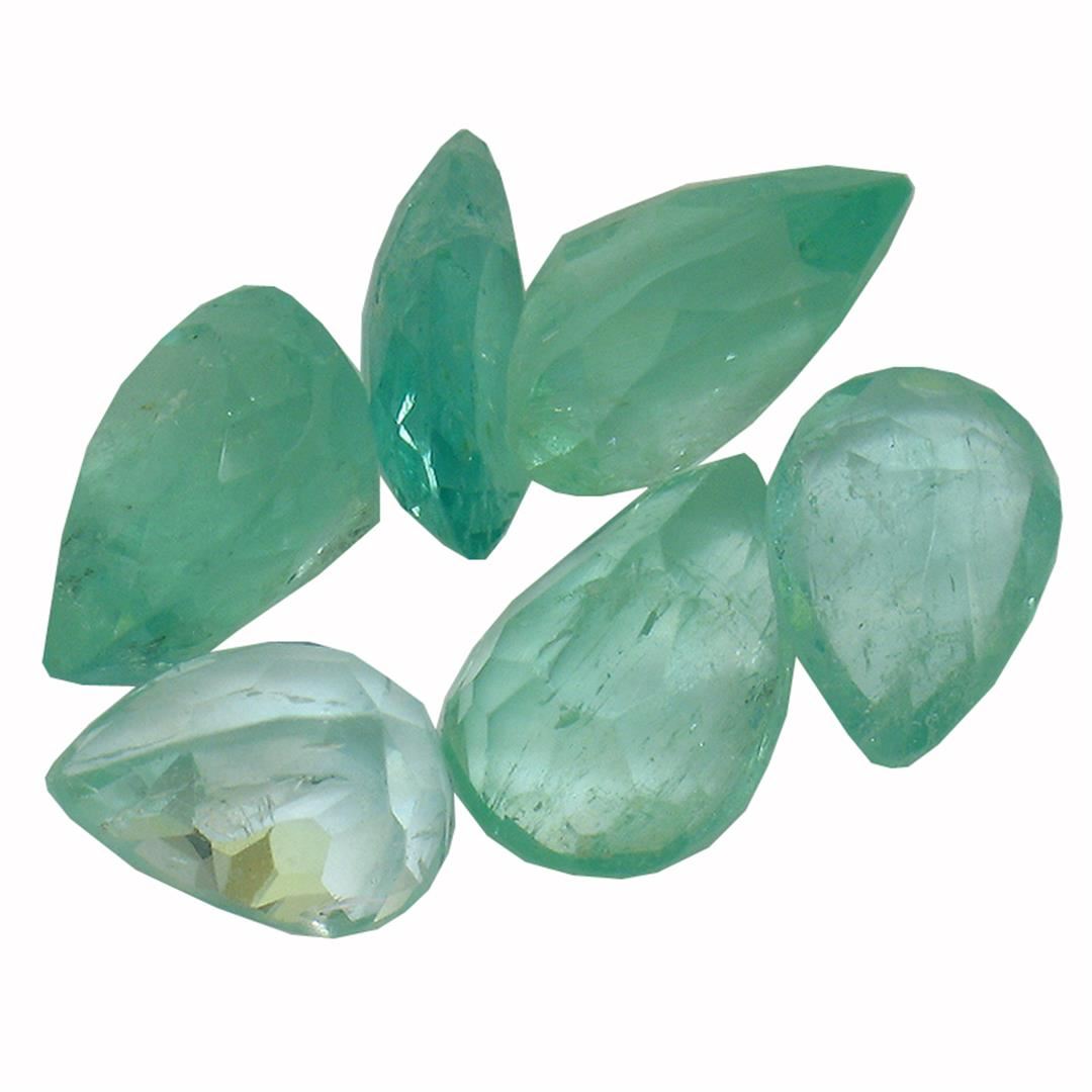 Six pear mixed cut natural emeralds exact total weight 3.53ct., clarity is heavily included, type III, medium, very slightly grayish, very slightly bluish green color, (GIA vslbG 5/3), cut is good. Westfield Appraised at $1,020.00.