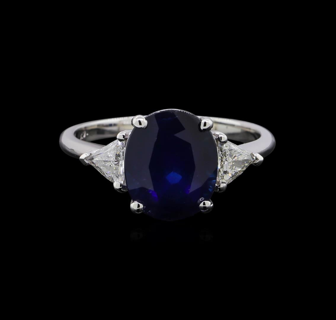 One electronically tested 14KT white gold ladies cast sapphire and diamond ring with a bright polish finish. The featured sapphire is set between mirroring triangle cut diamonds, completed by a one and one-half millimeter wide band. Identified with markings of "14K". Condition is good. Containing: One prong set oval mixed cut natural blue sapphire, measuring 9.90 x 8.30 x 5.20mm, approximate weight of 3.53ct., clarity is moderately included, type II, medium dark, very slightly grayish, blue color, (GIA B 6/3), cut is good. Transmitting light with a minimum of distortion, transparent. Naturally occurring internal & external characteristics are present. Graded in the setting. Two prong set triangle cut diamonds, measuring 3.90 x 4.20 x 2.60mm (depth est.) approximate total weight of 2 Stones = 0.40ct. Clarity: SI-2. Color: F - H. Total Weight of Colored Stones 3.53ct. Total Weight of Diamonds 0.40ct. Total Weight of Ring 3.17gm. AIG Appraised at $8,465.00.