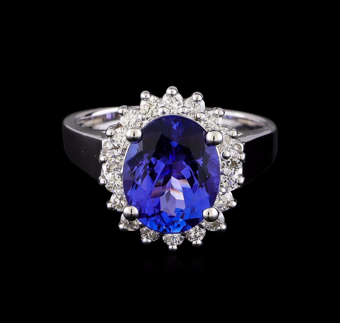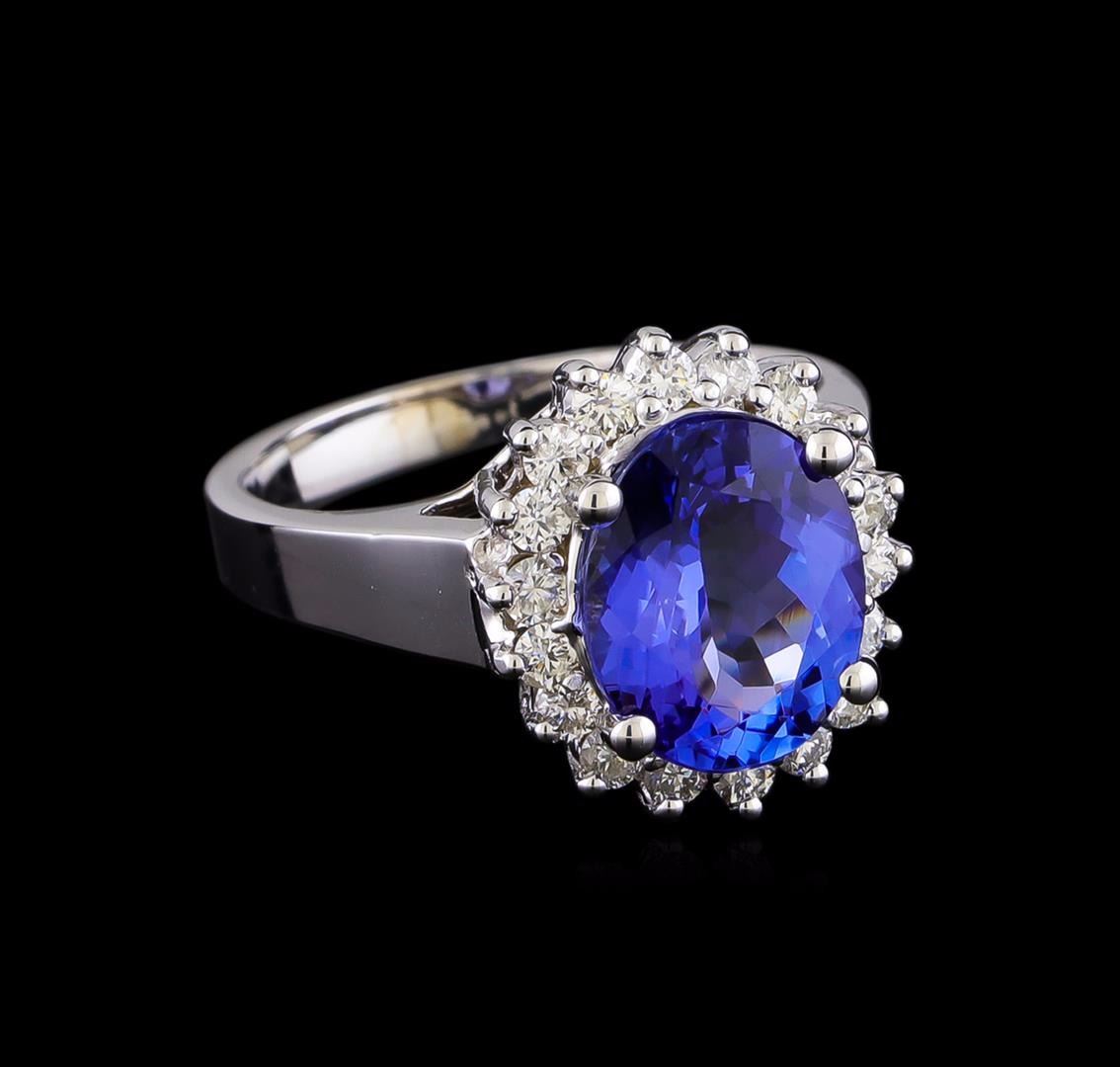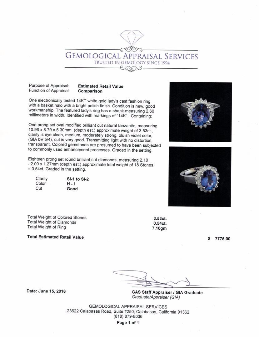 One electronically tested 14KT white gold lady's cast fashion ring with a basket halo with a bright polish finish. The featured lady's ring has a shank measuring 2.60 millimeters in width. Identified with markings of "14K". Condition is new, good workmanship. Containing: One prong set oval modified brilliant cut natural tanzanite, measuring 10.96 x 8.79 x 5.30mm, (depth est.) approximate weight of 3.53ct., clarity is eye clean, medium, moderately strong, bluish violet color, (GIA bV 5/4), cut is very good. Transmitting light with no distortion, transparent. Colored gemstones are presumed to have been subjected to commonly used enhancement processes. Graded in the setting. Eighteen prong set round brilliant cut diamonds, measuring 2.10 - 2.00 x 1.27mm (depth est.) approximate total weight of 18 Stones = 0.54ct. Graded in the setting. Clarity: SI-1 to SI-2. Color: H - I. Cut Good. Total Weight of Colored Stones 3.53ct. Total Weight of Diamonds 0.54ct. Total Weight of Ring 7.10gm. GAS Appraised at $7,775.00.