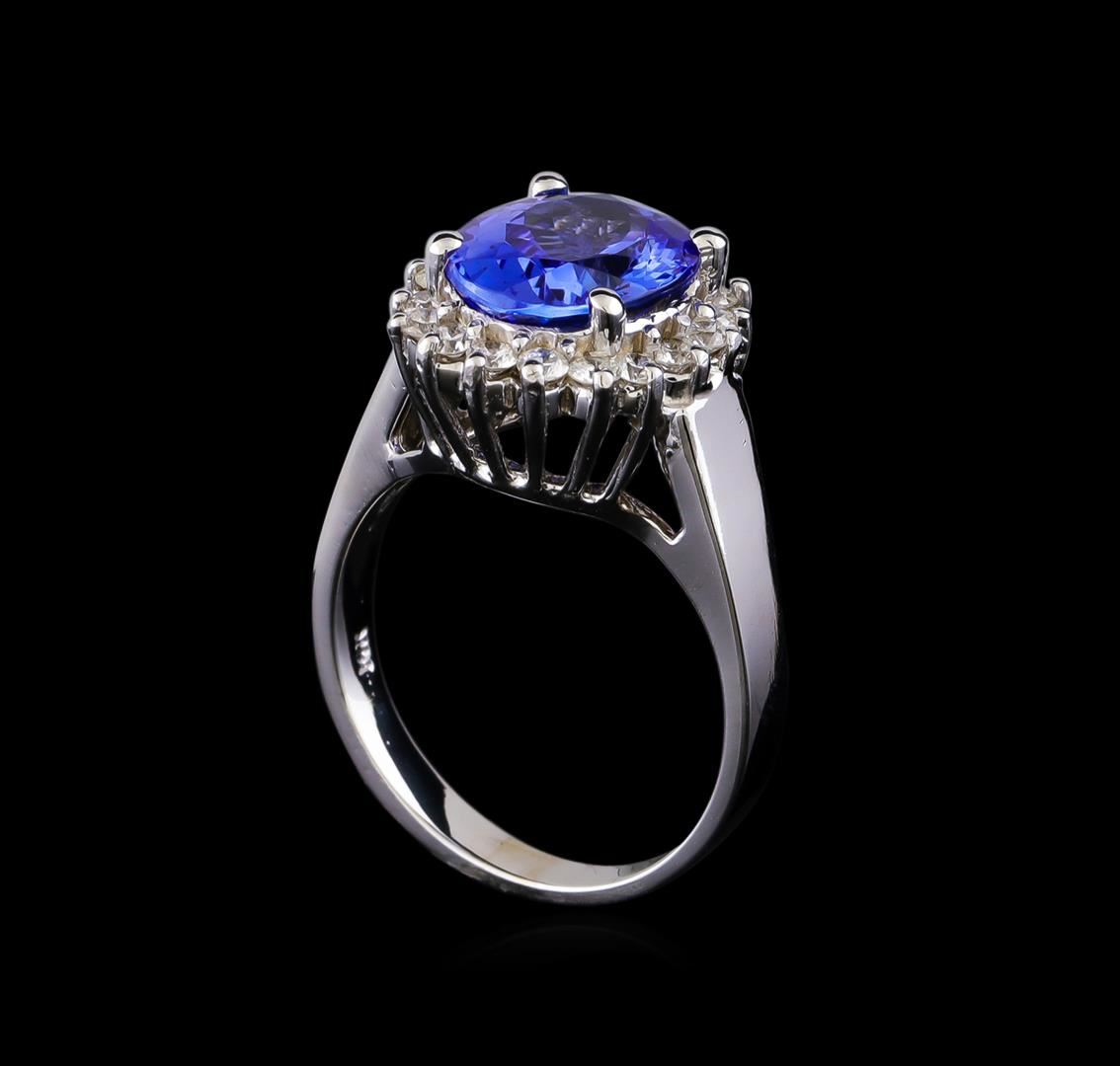 One electronically tested 14KT white gold lady's cast fashion ring with a basket halo with a bright polish finish. The featured lady's ring has a shank measuring 2.60 millimeters in width. Identified with markings of "14K". Condition is new, good workmanship. Containing: One prong set oval modified brilliant cut natural tanzanite, measuring 10.96 x 8.79 x 5.30mm, (depth est.) approximate weight of 3.53ct., clarity is eye clean, medium, moderately strong, bluish violet color, (GIA bV 5/4), cut is very good. Transmitting light with no distortion, transparent. Colored gemstones are presumed to have been subjected to commonly used enhancement processes. Graded in the setting. Eighteen prong set round brilliant cut diamonds, measuring 2.10 - 2.00 x 1.27mm (depth est.) approximate total weight of 18 Stones = 0.54ct. Graded in the setting. Clarity: SI-1 to SI-2. Color: H - I. Cut Good. Total Weight of Colored Stones 3.53ct. Total Weight of Diamonds 0.54ct. Total Weight of Ring 7.10gm. GAS Appraised at $7,775.00.
