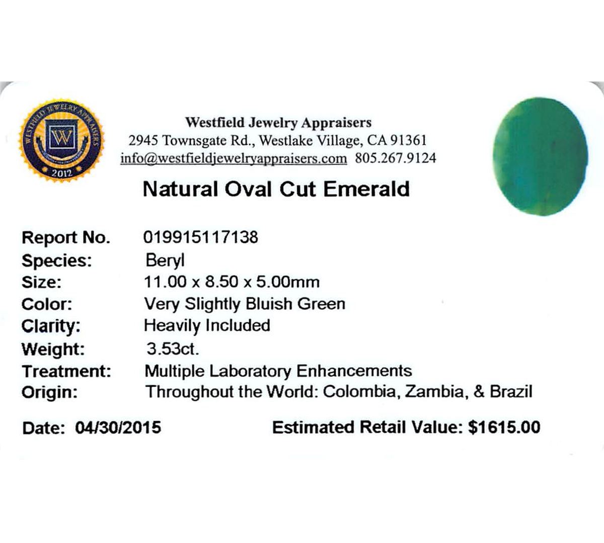 One oval mixed cut natural emerald exact weight 3.53ct., clarity is heavily included, type III, medium dark, very slightly grayish, very slightly bluish green color, (GIA vslbG 6/3), cut is good. Westfield Appraised at $1,615.00.