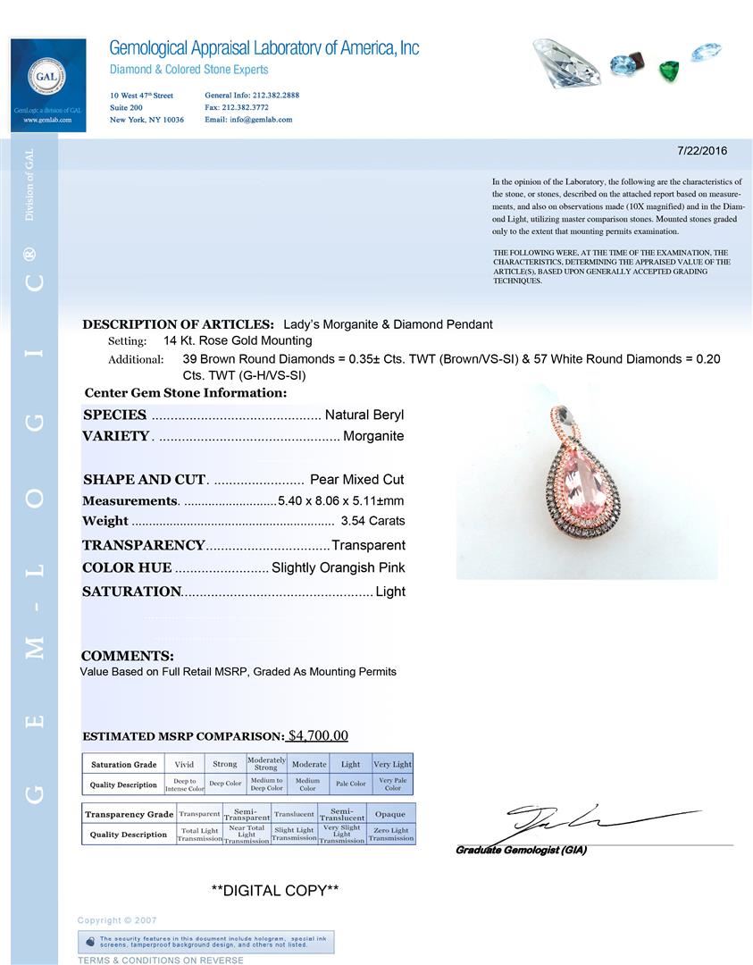 One Lady's Morganite and Diamond Pendant. Setting: 14 Kt. Rose Gold Mounting. Additional: 39 Brown Round Diamonds = 0.35 Cts. TWT (Brown/VS-SI) and 57 White Round Diamonds = 0.20 Cts. TWT (G-H/VS-SI). Center Gem Stone Information: Center Gem Stone Information: Species: Natural Beryl. Variety: Morganite. Shape and Cut: Pear Mixed Cut. Measurements: 5.40 x 8.06 x 5.11 mm. Weight: 3.54 Carats. Transparency: Transparent. Color Hue: Slightly Orange Pink. Saturation: Light. Total Weight: 2.87 grams.