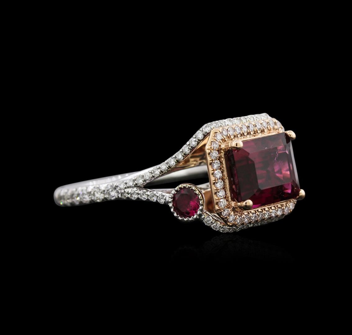 One electronically tested 14KT white and rose gold ladies cast rubellite tourmaline and diamond ring with a bright polish finish. The featured rubellite tourmaline is set within a diamond bezel supported by a diamond accented floral under gallery and diamond set split shoulders with a single rubellite tourmaline on either side, completed by a two millimeter wide band. Identified with markings of "14K". Condition is good. Containing: Three prong & bezel set rectangular and round mixed cut natural rubellites approximate total weight of 3.54ct., clarity is slightly included, type III, medium dark, very slightly brownish, strongly purplish red color, (GIA stpR 6/3), cut is good. Transmitting light with a minimum of distortion, transparent. Naturally occurring internal & external characteristics are present. Color grade is an average for the group. Graded in the setting. Eighty prong & bezel set round brilliant cut diamonds approximate total weight of 80 Stones = 1.21ct. Graded in the setting. Clarity: SI-1 to SI-2. Color: G - I. Total Weight of Colored Stones 3.54ct. Total Weight of Diamonds 1.21ct. Total Weight of Ring 8.84gm. AIG Appraised at $7,415.00.