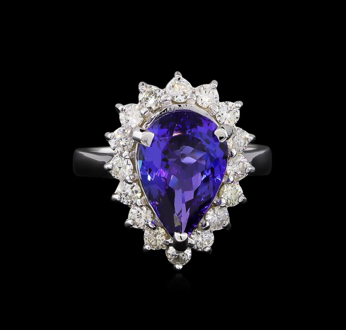 One electronically tested 14KT white gold lady's cast fashion ring with a basket halo with a bright polish finish. The featured lady's ring has a shank measuring 2.28 millimeters wide. Identified with markings of "K14". Condition is new, good workmanship. Containing: One prong set pear modified brilliant cut natural tanzanite, measuring 12.65 x 8.51 x 5.22mm, approximate weight of 3.54ct., clarity is eye clean, type I, medium dark, strong, violetish blue color, (GIA vB 6/5), cut is very good. Transmitting light with no distortion, transparent. Colored gemstones are presumed to have been subjected to commonly used enhancement processes. Graded in the setting. Sixteen prong set round brilliant cut diamonds, measuring 2.40 - 2.30 x 1.46mm (depth est.) approximate total weight of 16 Stones = 0.78ct. Graded in the setting. Clarity: SI-1 to SI-2. Color: G - I. Cut Good. Total Weight of Colored Stones 3.54ct. Total Weight of Diamonds 0.78ct. Total Weight of Ring 6.00gm. GAS Appraised at $8,780.00.
