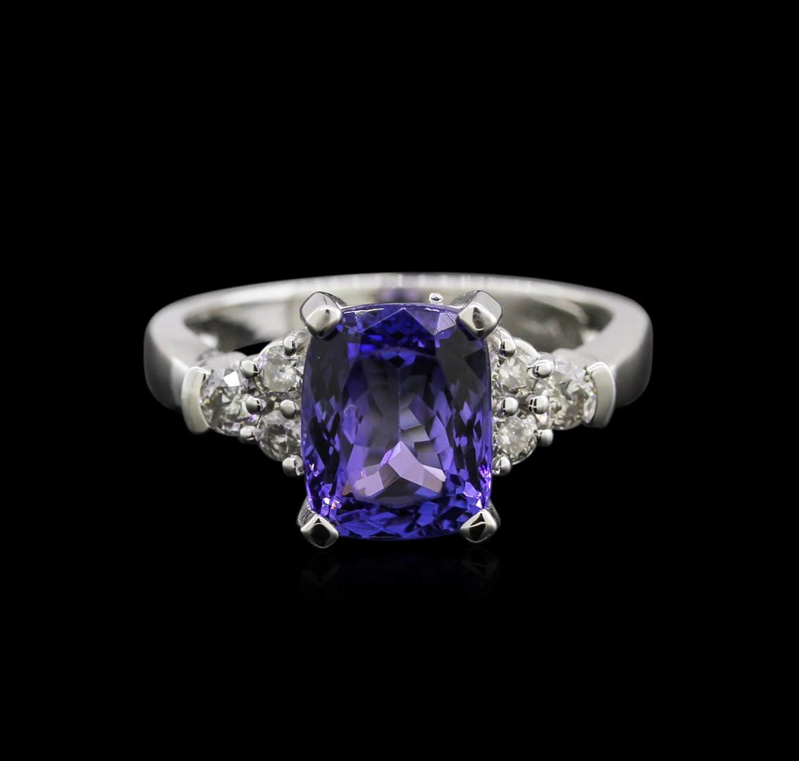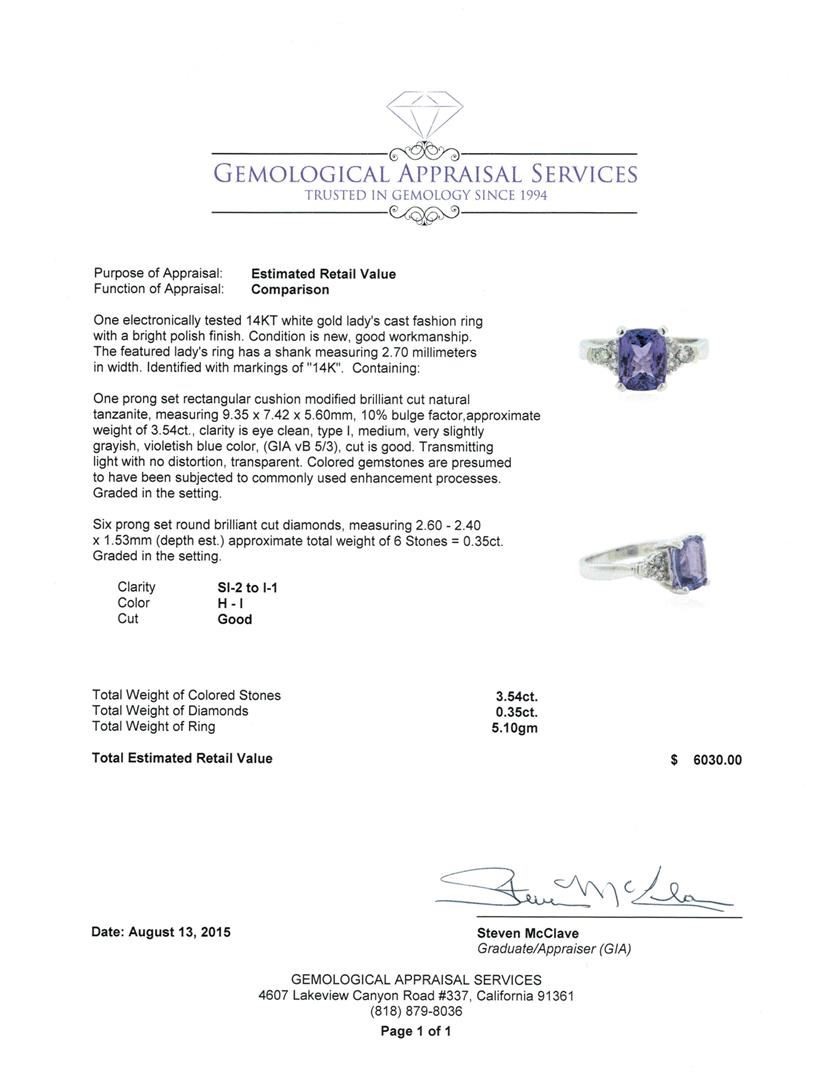 One electronically tested 14KT white gold lady's cast fashion ring with a bright polish finish. The featured lady's ring has a shank measuring 2.70 millimeters in width. Identified with markings of "14K". Condition is new, good workmanship. Containing: One prong set rectangular cushion modified brilliant cut natural tanzanite, measuring 9.35 x 7.42 x 5.60mm, 10% bulge factor, approximate weight of 3.54ct., clarity is eye clean, type I, medium, very slightly grayish, violetish blue color, (GIA vB 5/3), cut is good. Transmitting light with no distortion, transparent. Colored gemstones are presumed to have been subjected to commonly used enhancement processes. Graded in the setting. Six prong set round brilliant cut diamonds, measuring 2.60 - 2.40 x 1.53mm (depth est.) approximate total weight of 6 Stones = 0.35ct. Graded in the setting. Clarity: SI-2 to I-1. Color: H - I. Cut Good. Total Weight of Colored Stones 3.54ct. Total Weight of Diamonds 0.35ct. Total Weight of Ring 5.10gm. GAS Appraised at $6,030.00.