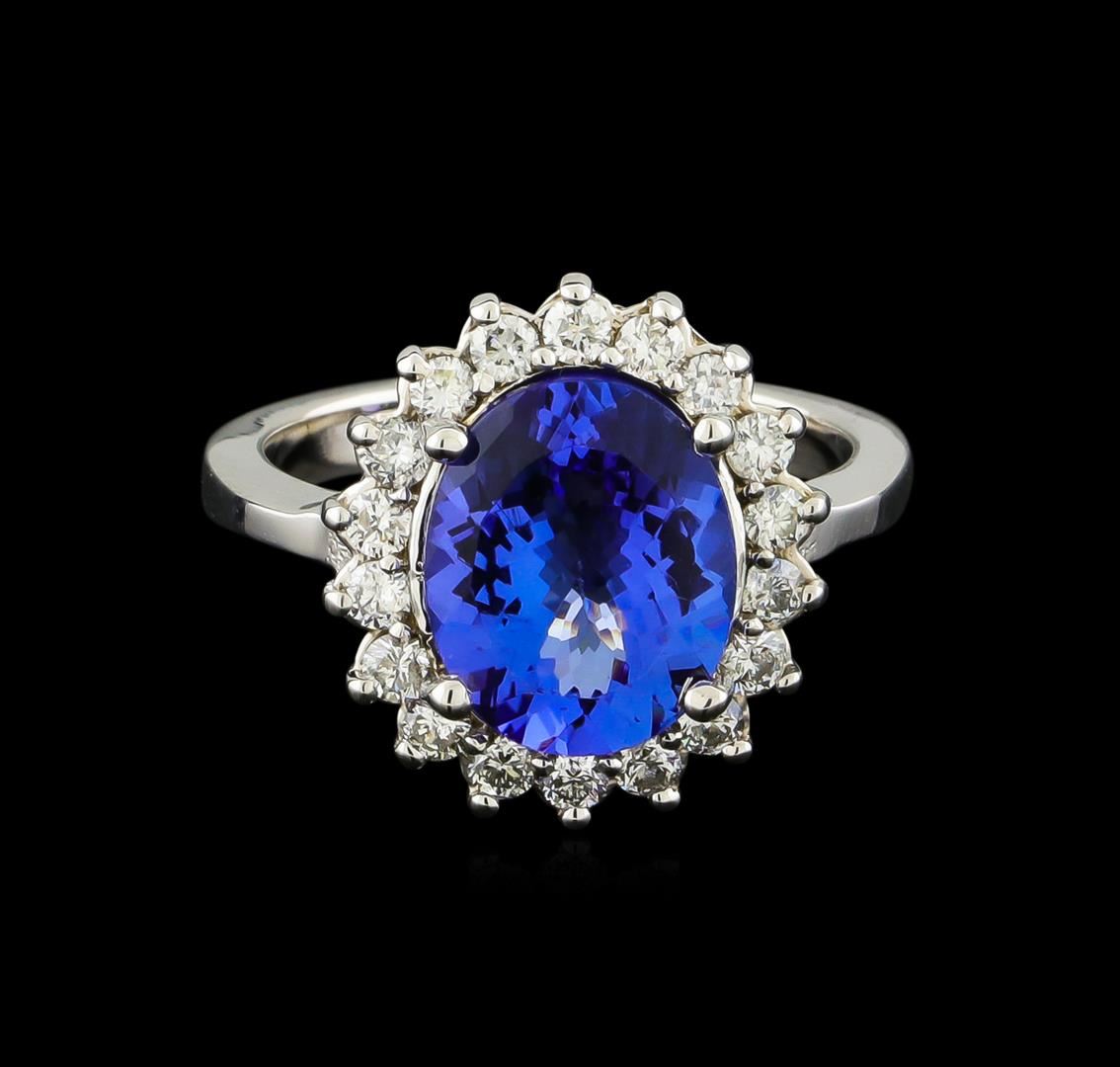 One electronically tested 14KT white gold lady's cast fashion ring with a basket halo with a bright polish finish. The featured lady's ring has a shank measuring 2.77 millimeters wide. Identified with markings of "14K". Condition is new, good workmanship. Containing: One prong set oval modified brilliant cut natural tanzanite, measuring 11.02 x 8.92 x 4.95mm, 4%. bulge factor, approximate weight of 3.54ct., clarity is eye clean, type I, medium dark, moderately strong, violetish blue color, (GIA vB 6/4), cut is very good. Transmitting light with no distortion, transparent. Colored gemstones are presumed to have been subjected to commonly used enhancement processes. Graded in the setting. Eighteen prong set round brilliant cut diamonds, measuring 2.10 - 2.00 x 1.27mm (depth est.) approximate total weight of 18 Stones = 0.60ct. Graded in the setting. Clarity: SI-1 to SI-2. Color: H - I. Cut Good. Total Weight of Colored Stones 3.54ct. Total Weight of Diamonds 0.60ct. Total Weight of Ring 5.80gm. GAS Appraised at $8,315.00.