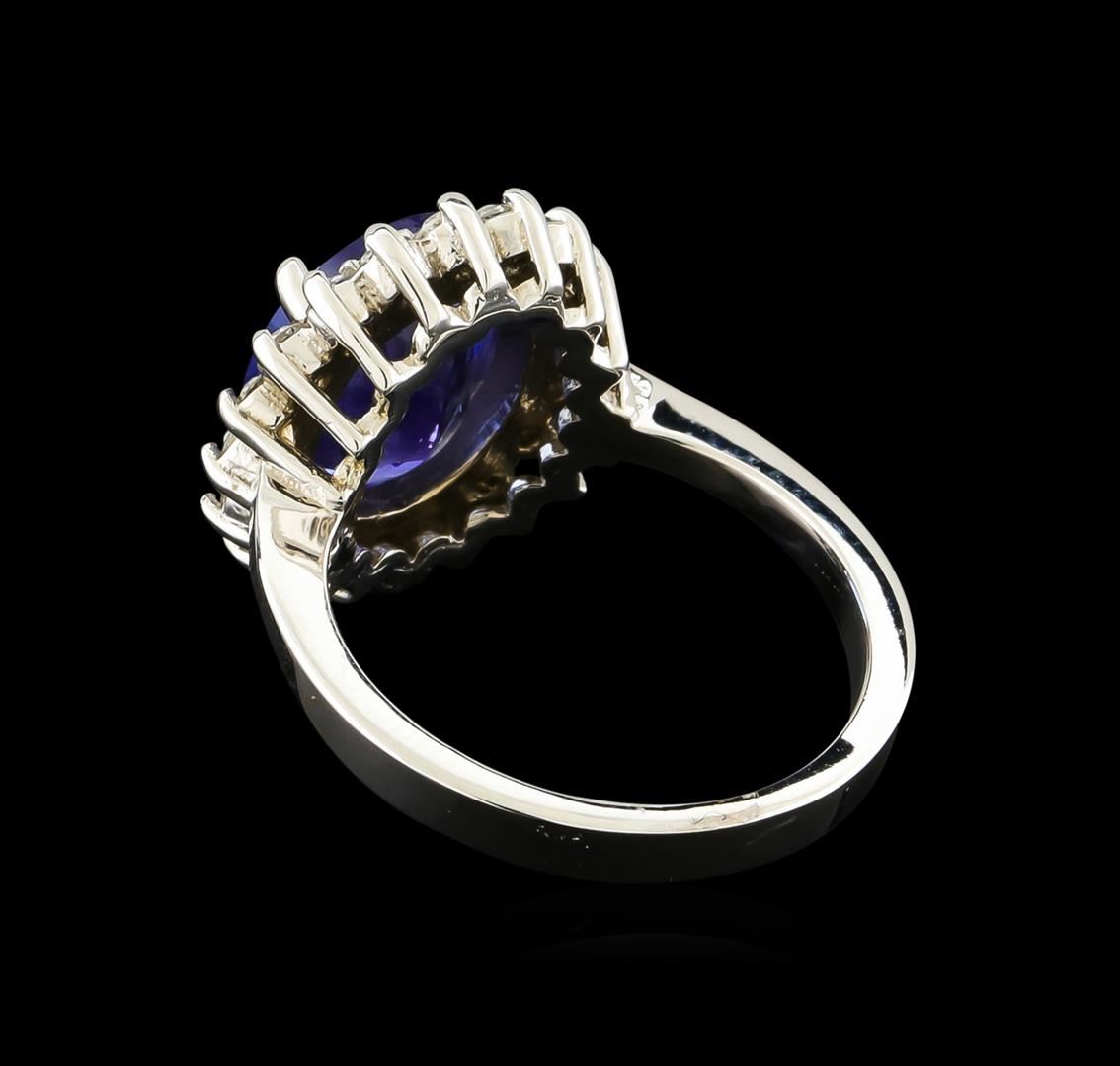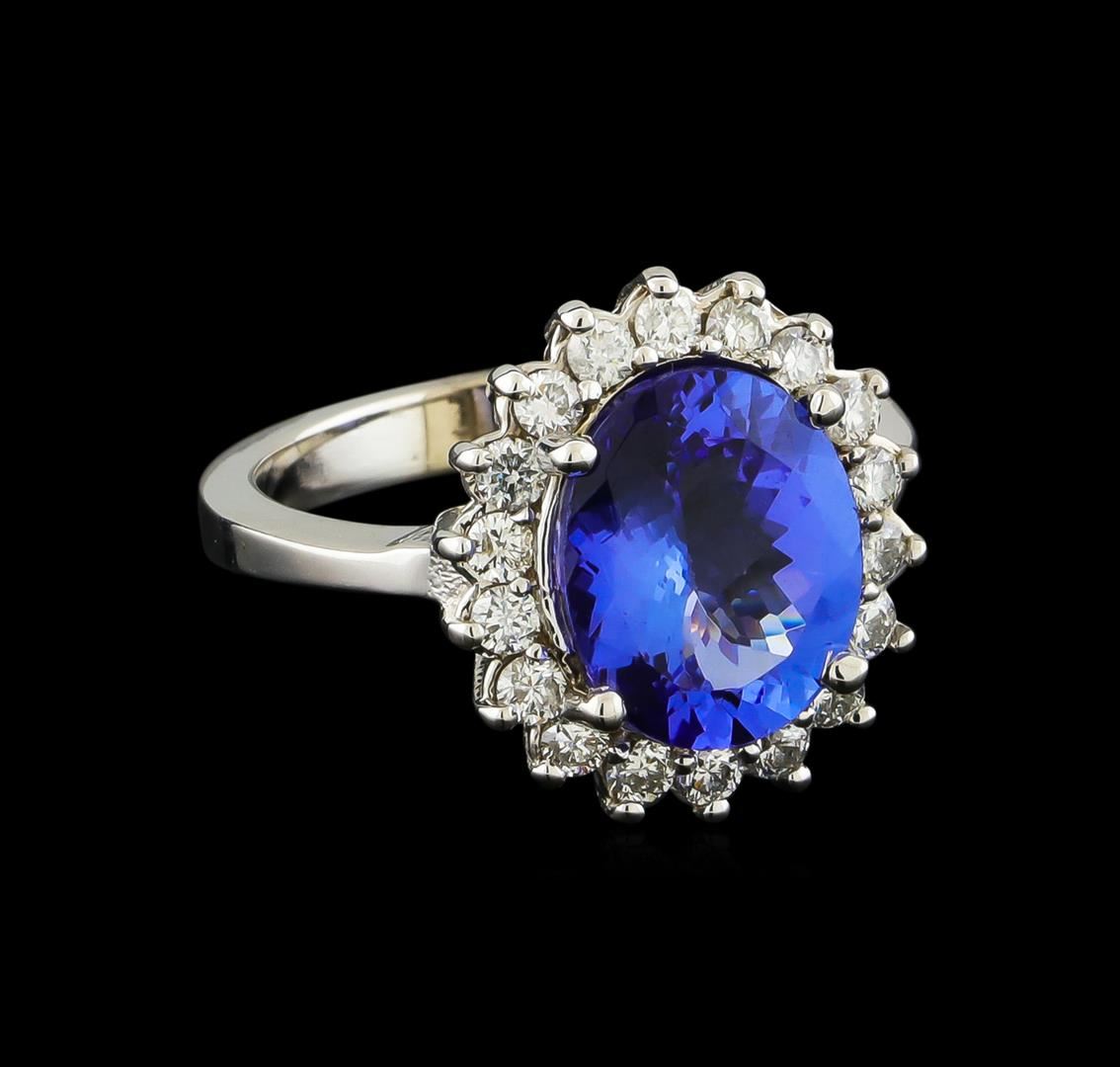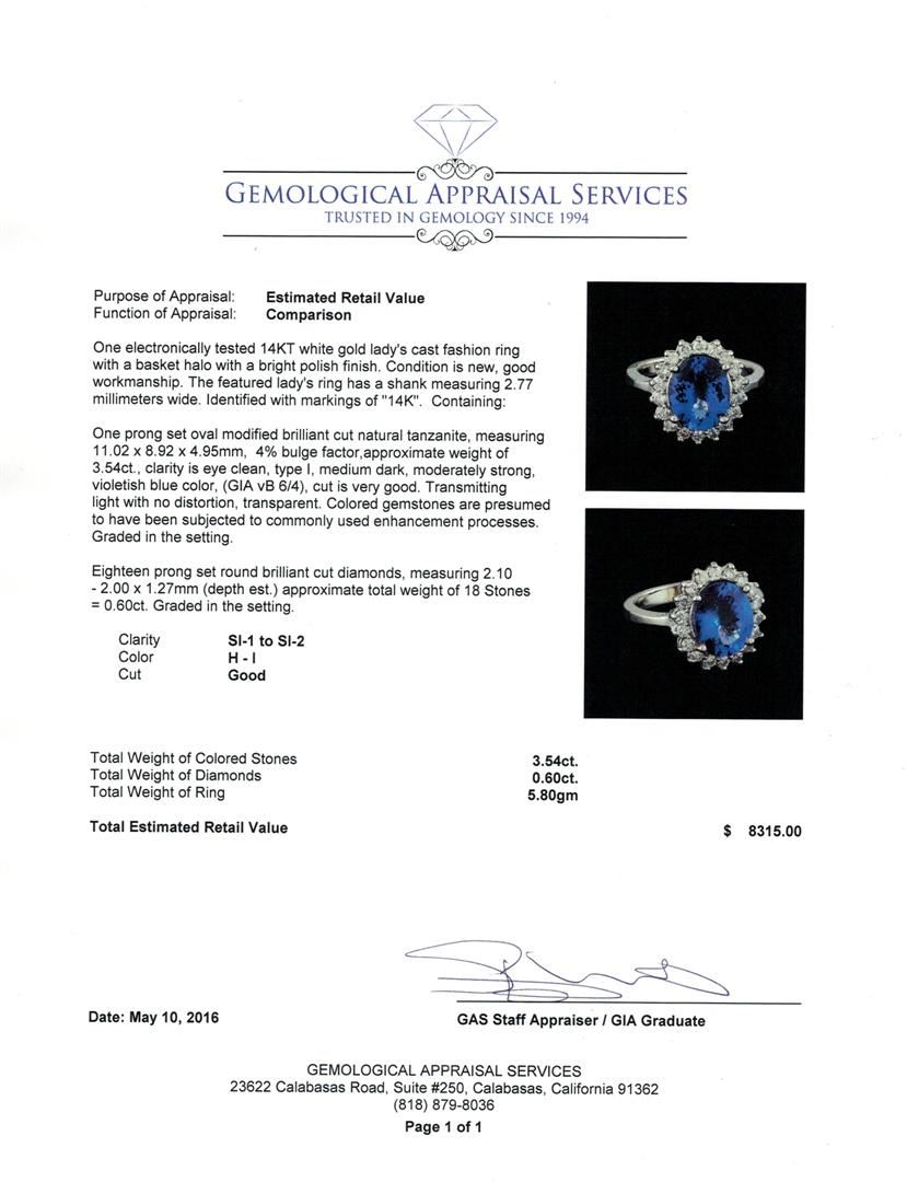 One electronically tested 14KT white gold lady's cast fashion ring with a basket halo with a bright polish finish. The featured lady's ring has a shank measuring 2.77 millimeters wide. Identified with markings of "14K". Condition is new, good workmanship. Containing: One prong set oval modified brilliant cut natural tanzanite, measuring 11.02 x 8.92 x 4.95mm, 4%. bulge factor, approximate weight of 3.54ct., clarity is eye clean, type I, medium dark, moderately strong, violetish blue color, (GIA vB 6/4), cut is very good. Transmitting light with no distortion, transparent. Colored gemstones are presumed to have been subjected to commonly used enhancement processes. Graded in the setting. Eighteen prong set round brilliant cut diamonds, measuring 2.10 - 2.00 x 1.27mm (depth est.) approximate total weight of 18 Stones = 0.60ct. Graded in the setting. Clarity: SI-1 to SI-2. Color: H - I. Cut Good. Total Weight of Colored Stones 3.54ct. Total Weight of Diamonds 0.60ct. Total Weight of Ring 5.80gm. GAS Appraised at $8,315.00.