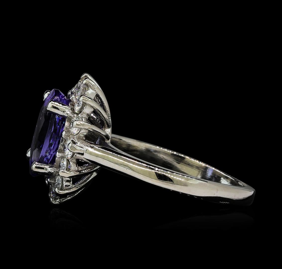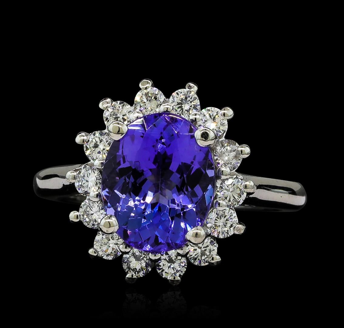 One electronically tested 14KT white gold lady's cast fashion ring with a basket halo with a bright polish finish. The featured lady's ring has a shank measuring 2.14 millimeters wide. Identified with markings of '14K'. Condition is new, good workmanship. Containing: One prong set oval modified brilliant cut natural tanzanite, measuring 10.58 x 8.57 x 5.59mm, (depth est.) approximate weight of 3.54ct., clarity is eye clean, medium, moderately strong, bluish violet color, (GIA bV 5/4), cut is very good. Transmitting light with no distortion, transparent. Colored gemstones are presumed to have been subjected to commonly used enhancement processes. Graded in the setting. Fourteen prong set round brilliant cut diamonds, measuring 2.40 - 2.30 x 1.46mm (depth est.) approximate total weight of 14 Stones = 0.70ct. Graded in the setting. Clarity VS-2 to SI-2. Color: G - H Cut Good. Total Weight of Colored Stones 3.54ct.. Total Weight of Diamonds 0.70ct.. Total Weight of Ring 5.70gm. GAS Appraised at $8,215.00.