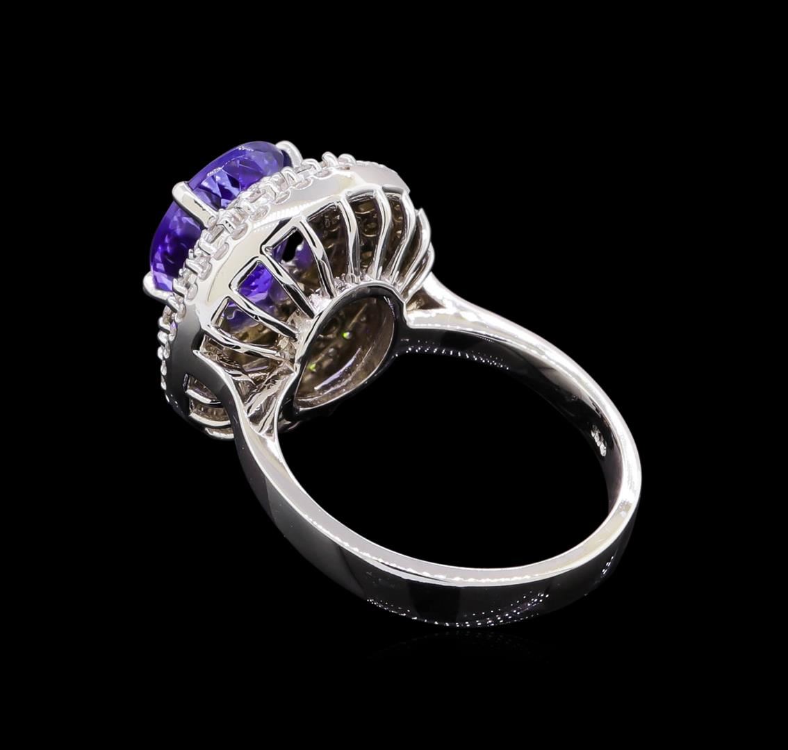 One electronically tested 14KT white gold lady's cast fashion ring with a triple basket halo with a bright polish finish. The featured lady's ring has a shank measuring 3.51 millimeters wide. Identified with markings of "K14". Condition is new, good workmanship. Containing: One prong set oval modified brilliant cut natural tanzanite, measuring 10.46 x 8.37 x 5.71mm, approximate weight of 3.54ct., clarity is eye clean, type I, medium dark, moderately strong, violetish blue color, (GIA vB 6/4), cut is very good. Transmitting light with no distortion, transparent. Colored gemstones are presumed to have been subjected to commonly used enhancement processes. Graded in the setting. Sixteen prong set round brilliant cut diamonds, measuring 1.90 - 1.80 x 1.17mm (depth est.) approximate total weight of 16 Stones = 0.40ct. Graded in the setting. Clarity: VS-2 to SI-2. Color: G - Very Good Sixty-Two prong set round brilliant cut diamonds, measuring 1.25 - 1.15 x 0.74mm (depth est.) approximate total weight of 62 Stones = 0.40ct. Graded in the setting. Clarity: SI-1 to I-1. Color: H - I. Cut Good. Total Weight of Colored Stones 3.54ct. Total Weight of Diamonds 0.80ct. Total Weight of Ring 7.30gm. GAS Appraised at $9,770.00.