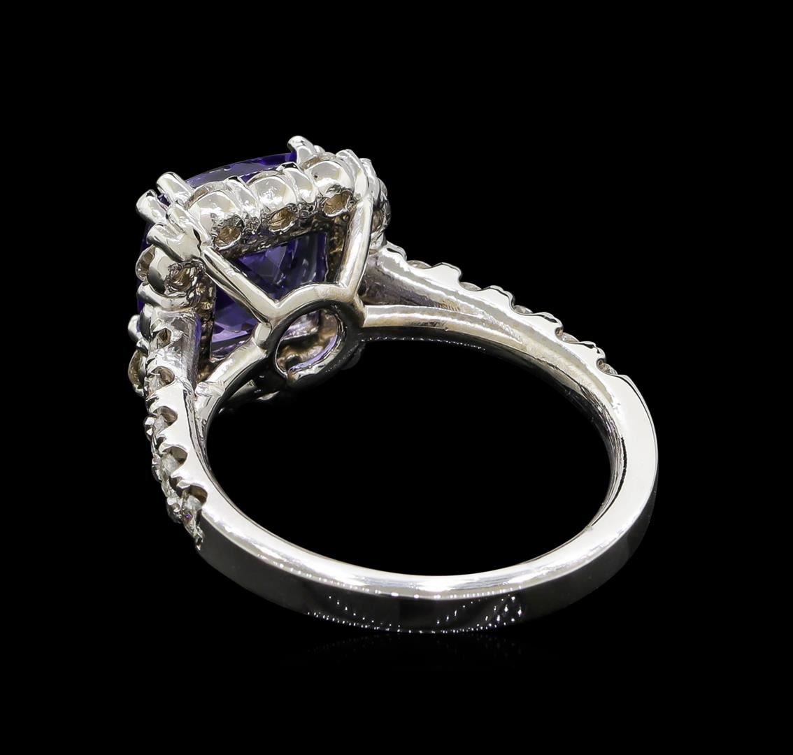 One electronically tested 14KT white gold lady's cast fashion ring with a cathedral halo with a bright polish finish. The featured lady's ring has a shank measuring 2.29 millimeters wide. Identified with markings of '14K'. Condition is new, good workmanship. Containing: One prong set square cushion modified brilliant cut natural tanzanite, measuring 8.75 x 8.73 x 5.52mm, (depth est.) 6%. bulge factor, approximate weight of 3.54ct., clarity is eye clean, medium, moderately strong, violetish blue color, (GIA vB 5/4), cut is very good. Transmitting light with no distortion, transparent. Colored gemstones are presumed to have been subjected to commonly used enhancement processes. Graded in the setting. Twelve prong set round brilliant cut diamonds, measuring 2.40 - 2.30 x 1.46mm (depth est.) approximate total weight of 12 Stones = 0.60ct. Graded in the setting. Clarity SI-1 to I-1. Color: H - I Cut Good Ten prong set round brilliant cut diamonds, measuring 2.10 - 2.00 x 1.27mm (depth est.) approximate total weight of 10 Stones = 0.33ct. Graded in the setting. Clarity SI-1 to SI-2. Color: H - I Cut Good. Total Weight of Colored Stones 3.54ct.. Total Weight of Diamonds 0.93ct.. Total Weight of Ring 5.80gm GAS Appraised at $8,540.00.