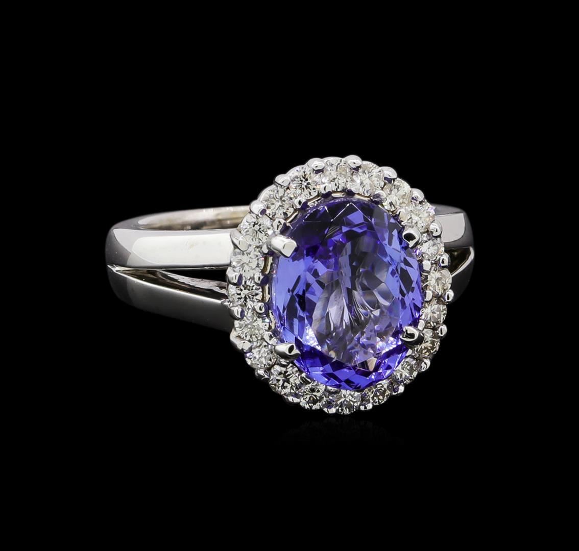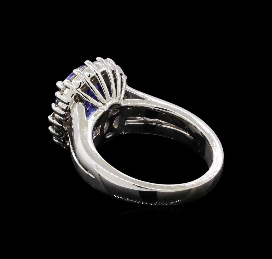 One electronically tested 14KT white gold lady's cast fashion ring with a split shank basket halo with a bright polish finish. The featured lady's ring has a shank measuring 3.0 millimeters in width. Identified with markings of '14K'. Condition is new, good workmanship. Containing: One prong set oval modified brilliant cut natural tanzanite, measuring 10.81 x 8.39 x 5.45mm, (depth est.) 3%. bulge factor, approximate weight of 3.54ct., clarity is eye clean, medium light, moderately strong, violetish blue color, (GIA vB 4/4), cut is good. Transmitting light with no distortion, transparent. Colored gemstones are presumed to have been subjected to commonly used enhancement processes. Graded in the setting. Twenty prong set round brilliant cut diamonds, measuring 1.90 - 1.85 x 1.17mm (depth est.) approximate total weight of 20 Stones = 0.50ct. Graded in the setting. Clarity SI-1 to SI-2. Color: H - I Cut Good. Total Weight of Colored Stones 3.54ct.. Total Weight of Diamonds 0.50ct.. Total Weight of Ring 9.00gm.