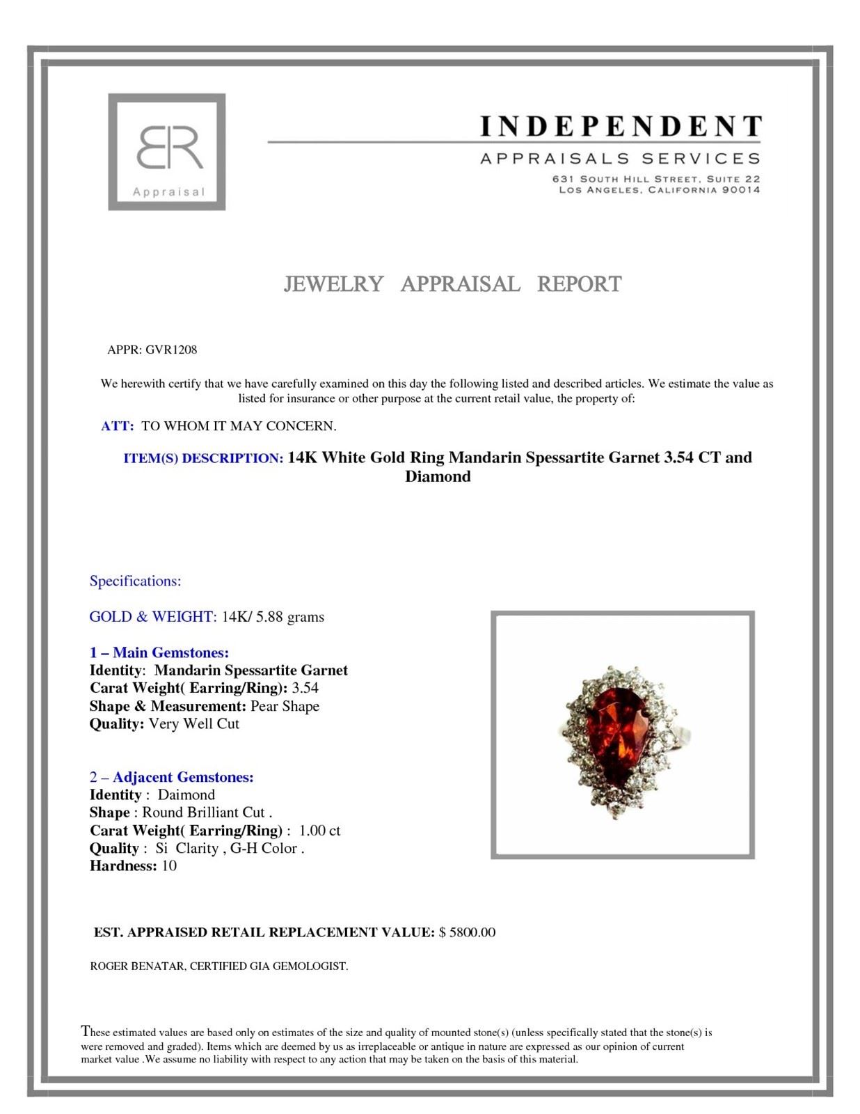 14K WHITE GOLD NATURAL SPESSARTITE RING:5.88 GRAMSS/SPESSARTITE:3.54CT/DIAMOND:1.00CT/#GVR1208 **Known as a powerful stone of attraction, this stunning 3.54ct Pear Shape Mandarin Spessartite Garnet casts a deep hue, surely to intoxicate. Surrounded by a burst of 1.00ct round brilliant cut Diamonds, this remarkable piece is crafted in 14k white gold.**
