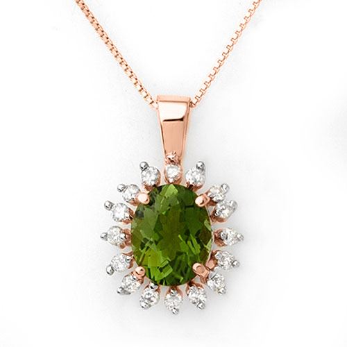 REF-72W8F -10796 ---- 3.55 CTW Green Tourmaline & Diamond Necklace 14K Rose Gold ---- Luxury Designer Brand Necklace Appraised at $5,600 Certificate Number US10796 14k Rose gold, Necklace Size is 16 Incehs, Necklace measuring approx. 1/2" x 9/16", weighing in total approx. 4.2 grams. Made in the USA and is stamped 14k, Main stone 3.15 carat total weight containing 1 pieces of Saturated Bluish Green color with AAA quality Oval shape cut Tourmaline , Stone #2 0.4 carat total weight containing 16 pieces of H-I color with VS/SI quality Round shape cut Diamond