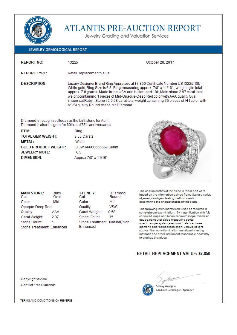 13225 - REF-102H2M ---- 3.55 CTW Ruby & Diamond Ring 18K White Gold ---- Luxury Designer Brand Ring Appraised at $7,850 Certificate Number US13225 18k White gold, Ring Size is 6.5, Ring measuring approx. 7/8" x 11/16" , weighing in total approx. 7.8 grams. Made in the USA and is stamped 18k, Main stone 2.97 carat total weight containing 1 pieces of Mid-Opaque-Deep Red color with AAA quality Oval shape cut Ruby , Stone #2 0.58 carat total weight containing 35 pieces of H-I color with VS/SI quality Round shape cut Diamond