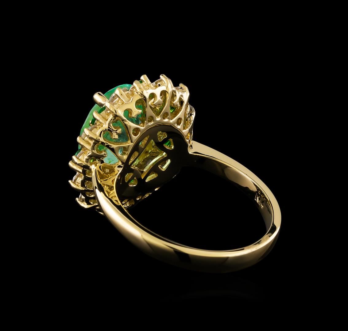 One electronically tested 14KT yellow gold lady's cast fashion ring with a double basket halo with a bright polish finish. The featured lady's ring has a shank measuring 2.76 millimeters wide. Identified with markings of "K14". Condition is new, good workmanship. Containing: One prong set oval modified brilliant cut natural emerald, measuring 11.12 x 8.65 x 6.18mm, (depth est.) approximate weight of 3.55ct., clarity is slightly included, medium light, moderately strong, green color, (GIA G 4/4), cut is good. Transmitting light with a minimum of distortion, transparent. Indications of oil residue. Naturally occurring internal & external characteristics are present. Colored gemstones are presumed to have been subjected to commonly used enhancement processes. Graded in the setting. Seven prong set round modified brilliant cut natural tsavorite garnets, measuring 2.70 - 2.60 x 1.73 mm, (depth est.) approximate total weight of 0.62ct., clarity is eye clean, medium dark, moderately strong, slightly yellowish green color, (GIA slyG 6/4), cut is good. Transmitting light with no distortion, transparent. Colored gemstones are presumed to have been subjected to commonly used enhancement processes. Graded in the setting. Seven prong set round brilliant cut diamonds, measuring 2.90 - 2.80 x 1.74mm (depth est.) approximate total weight of 7 Stones = 0.60ct. Graded in the setting. Clarity: SI-1 to SI-2. Color: H - I. Cut Good Fourteen prong set round brilliant cut diamonds, measuring 1.75 - 1.65 x 1.05mm (depth est.) approximate total weight of 14 Stones = 0.26ct. Graded in the setting. Clarity: SI-1 to SI-2. Color: H - I. Cut Good. Total Weight of Colored Stones 4.17ct. Total Weight of Diamonds 0.86ct. Total Weight of Ring 6.50gm. GAS Appraised at $8,040.00.