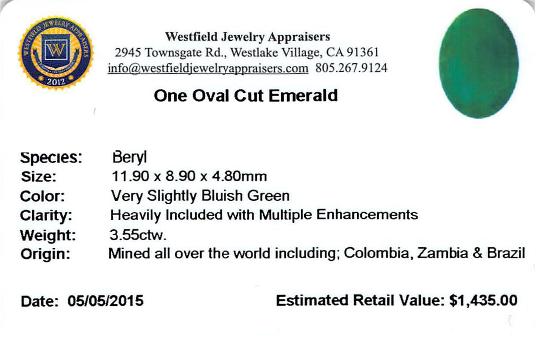 One oval mixed cut natural emerald, measuring 11.90 x 8.90 x 4.80mm, exact weight 3.55ct., clarity is heavily included, type III, medium dark, very slightly bluish green color, (GIA vslbG 6/0) Indications of multiple laboratory enhancements, including high temperature heat treatment. Westfield Appraised at $1,435.00.