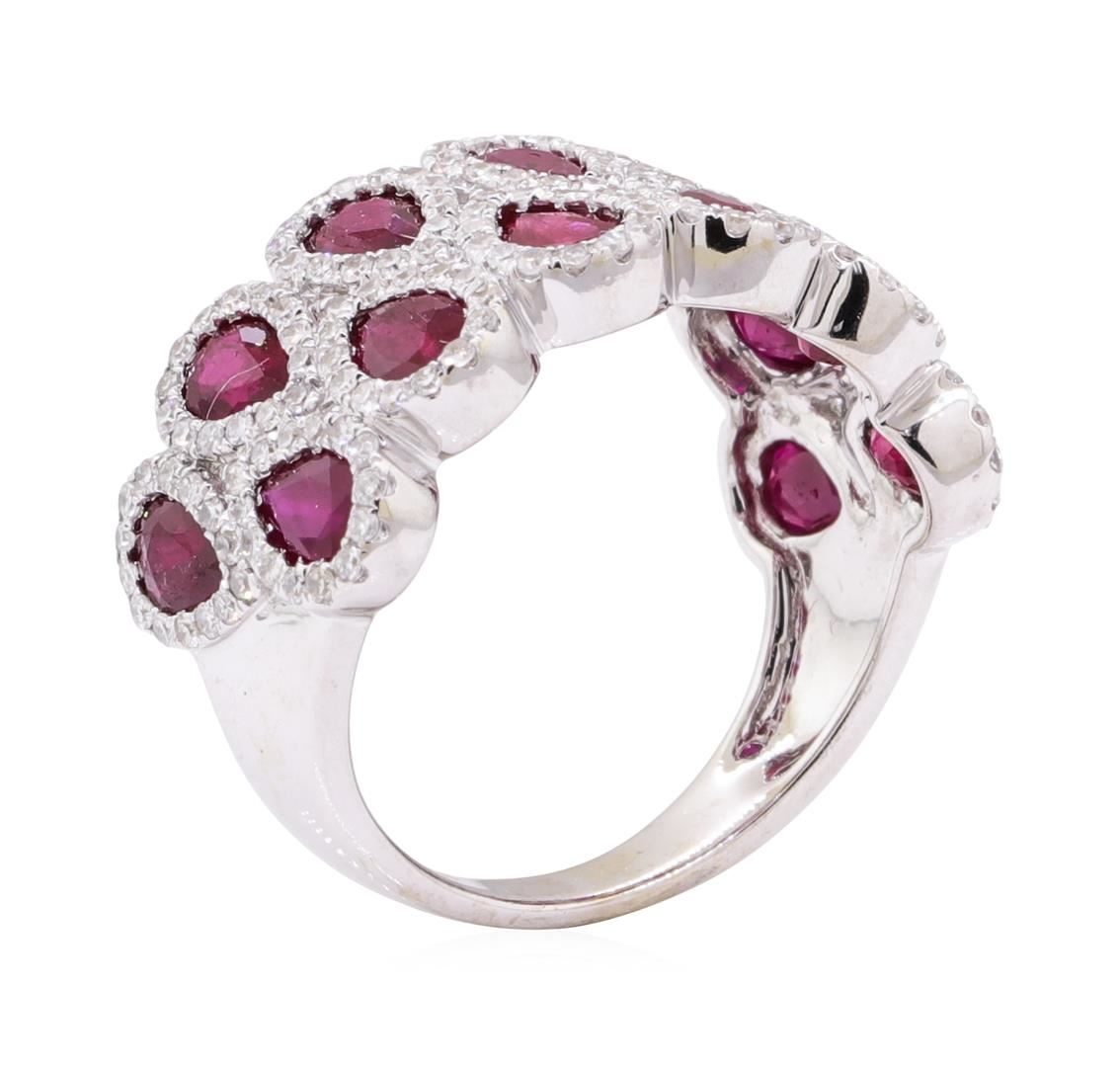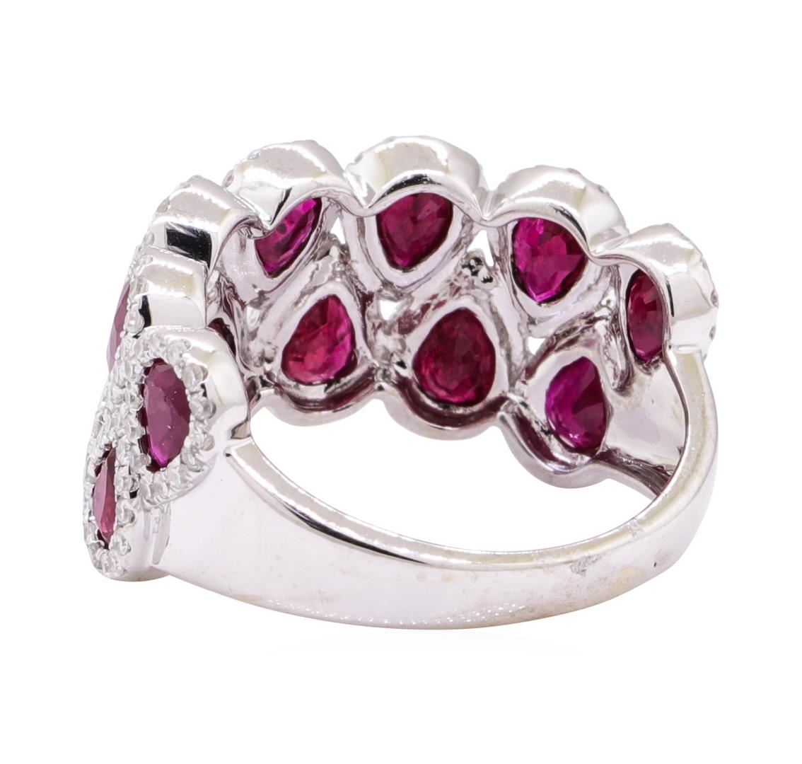 One electronically tested 14KT white gold lady's cast fashion ring with a tapered wide band with a bright polish finish. The featured lady's ring has an undulating scalloped motif and a shank measuring 2.60 millimeters wide. Identified with markings of '14K'. Condition is new, good workmanship. Containing: Thirteen prong set pear modified mixed cut natural rubies, measuring 4.50 x 3.20 x 1.90mm, (depth est.) approximate total weight of 2.90ct., clarity is heavily included, medium dark, moderately strong, red color, (GIA R 6/4), cut is good. Transmitting light somewhat diffusely, semi-transparent to translucent. Naturally occurring internal & external characteristics are present. Indications of laboratory high temperature heat treatment. Colored gemstones are presumed to have been subjected to commonly used enhancement processes. Graded in the setting. One Hundred Eighty-Two prong set single cut diamonds, measuring 1.00 - 0.95 x 0.61mm (depth est.) approximate total weight of 182 Stones = 0.65ct. Graded in the setting. Color H - I Clarity SI-1 to I-1 Cut Good. Total Weight of Colored Stones 2.90ct.. Total Weight of Diamonds 0.65ct.. Total Weight of Ring 4.70gm GAS Appraised at $4280.00. GAS Appraised at $4,280.00.
