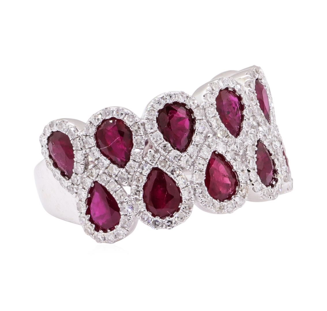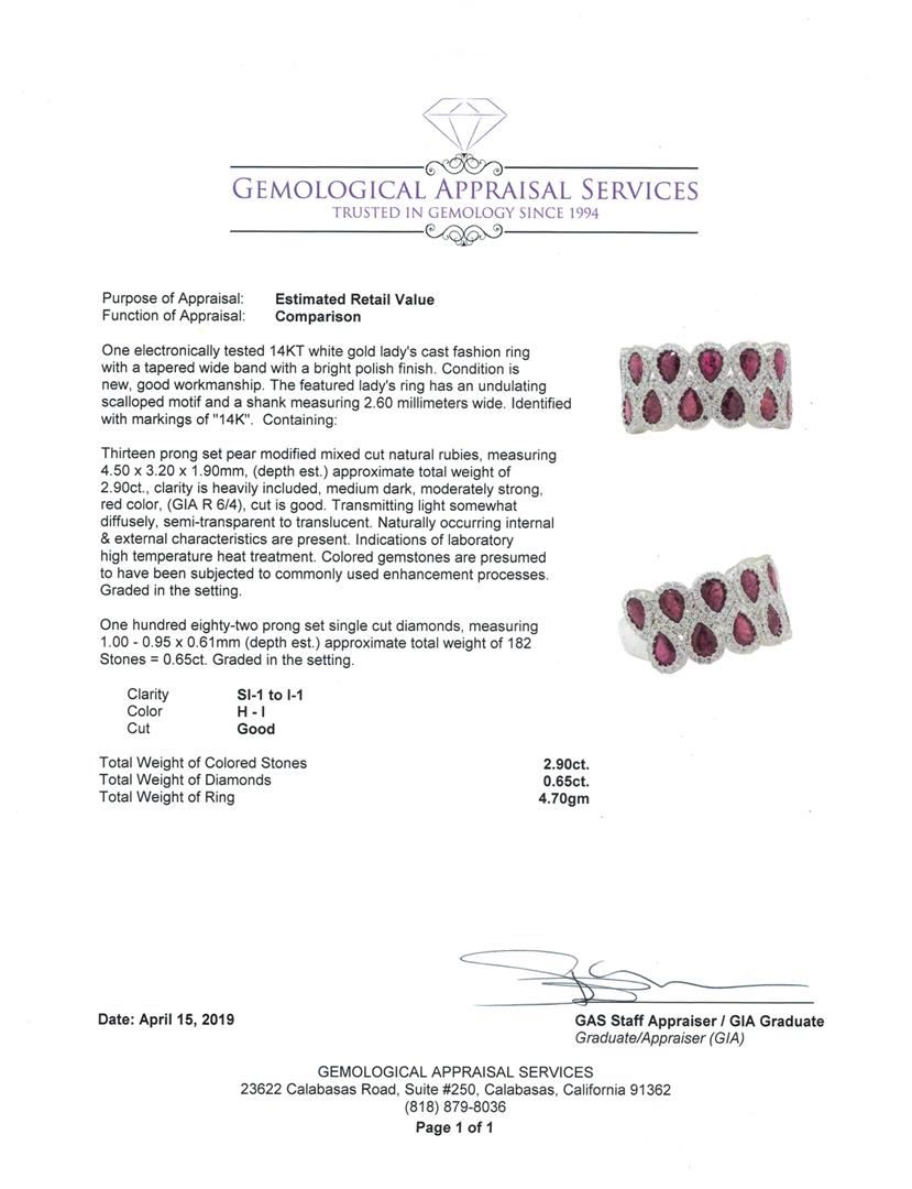 One electronically tested 14KT white gold lady's cast fashion ring with a tapered wide band with a bright polish finish. The featured lady's ring has an undulating scalloped motif and a shank measuring 2.60 millimeters wide. Identified with markings of '14K'. Condition is new, good workmanship. Containing: Thirteen prong set pear modified mixed cut natural rubies, measuring 4.50 x 3.20 x 1.90mm, (depth est.) approximate total weight of 2.90ct., clarity is heavily included, medium dark, moderately strong, red color, (GIA R 6/4), cut is good. Transmitting light somewhat diffusely, semi-transparent to translucent. Naturally occurring internal & external characteristics are present. Indications of laboratory high temperature heat treatment. Colored gemstones are presumed to have been subjected to commonly used enhancement processes. Graded in the setting. One Hundred Eighty-Two prong set single cut diamonds, measuring 1.00 - 0.95 x 0.61mm (depth est.) approximate total weight of 182 Stones = 0.65ct. Graded in the setting. Color H - I Clarity SI-1 to I-1 Cut Good. Total Weight of Colored Stones 2.90ct.. Total Weight of Diamonds 0.65ct.. Total Weight of Ring 4.70gm GAS Appraised at $4280.00. GAS Appraised at $4,280.00.